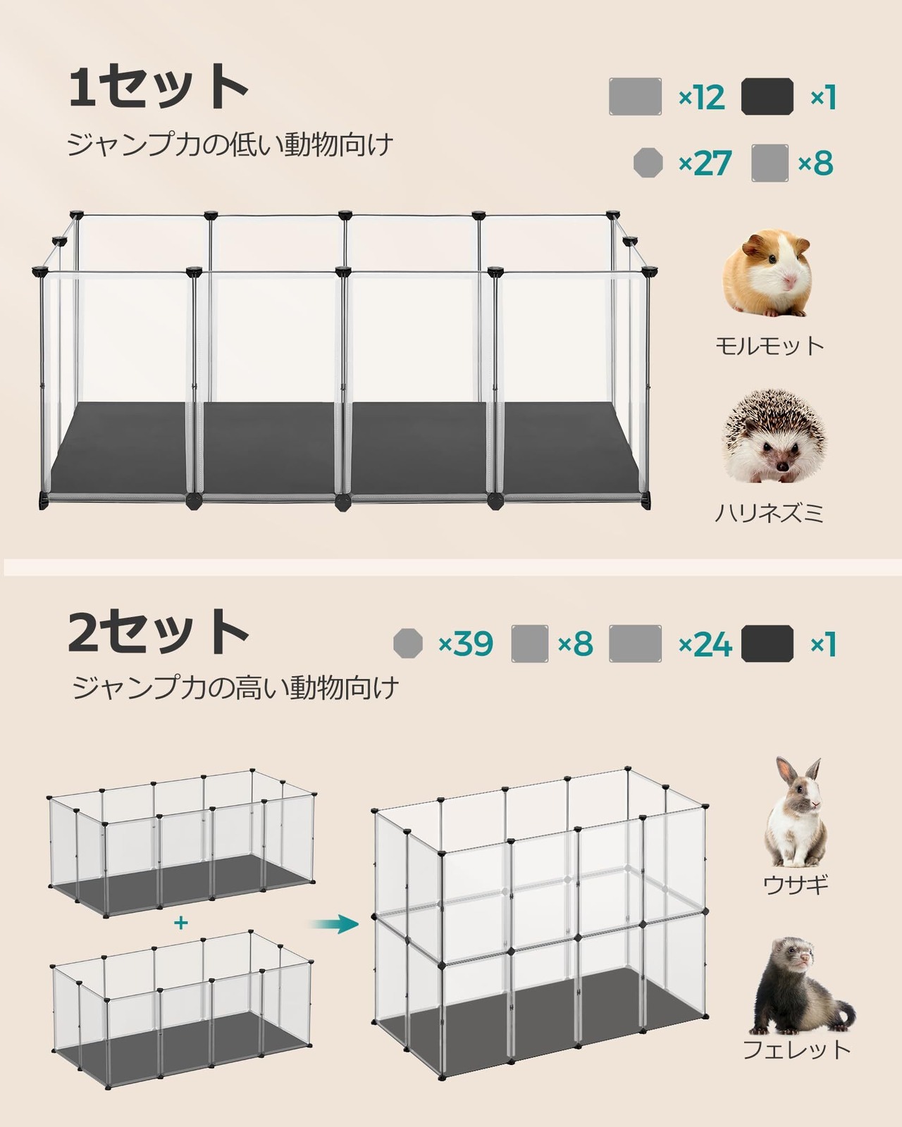 【カスタマイズ&拡張可能】 プラスチックパネルを自由に組み合わせることで、L字型のコーナーペンや2段式のゲージなど、さまざまなレイアウトが可能です。組み立て方の詳細は、商品ページの提案をご覧ください。