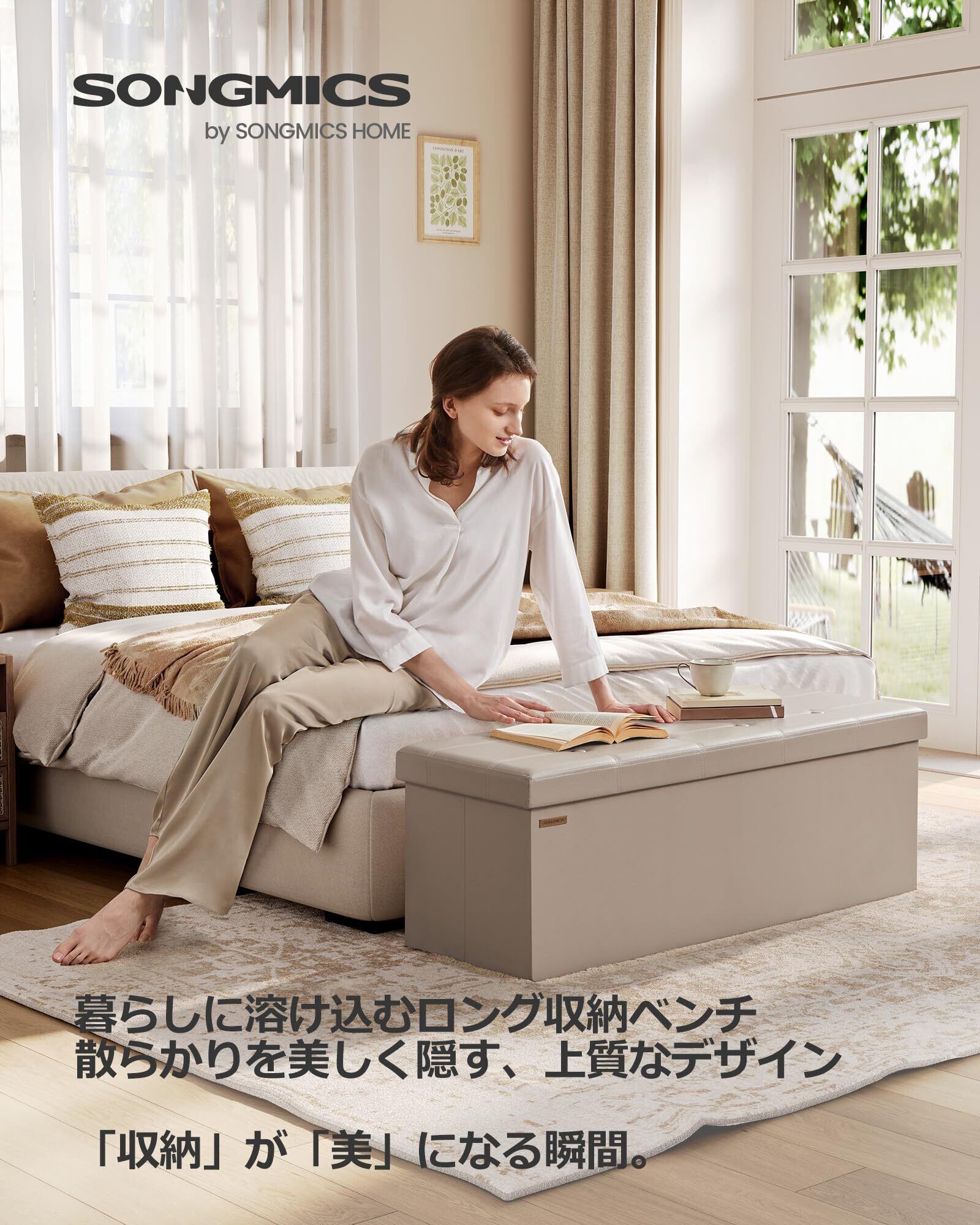[SONGMICS Mazie コレクション - オットマン 収納 スツール 43インチ 折りたたみ式収納オットマンベンチ、収納付きオットマン フットレストスツール 耐荷重300kg リビングルーム用 合成皮革 幅110 CM ベージュ LSF070K03]