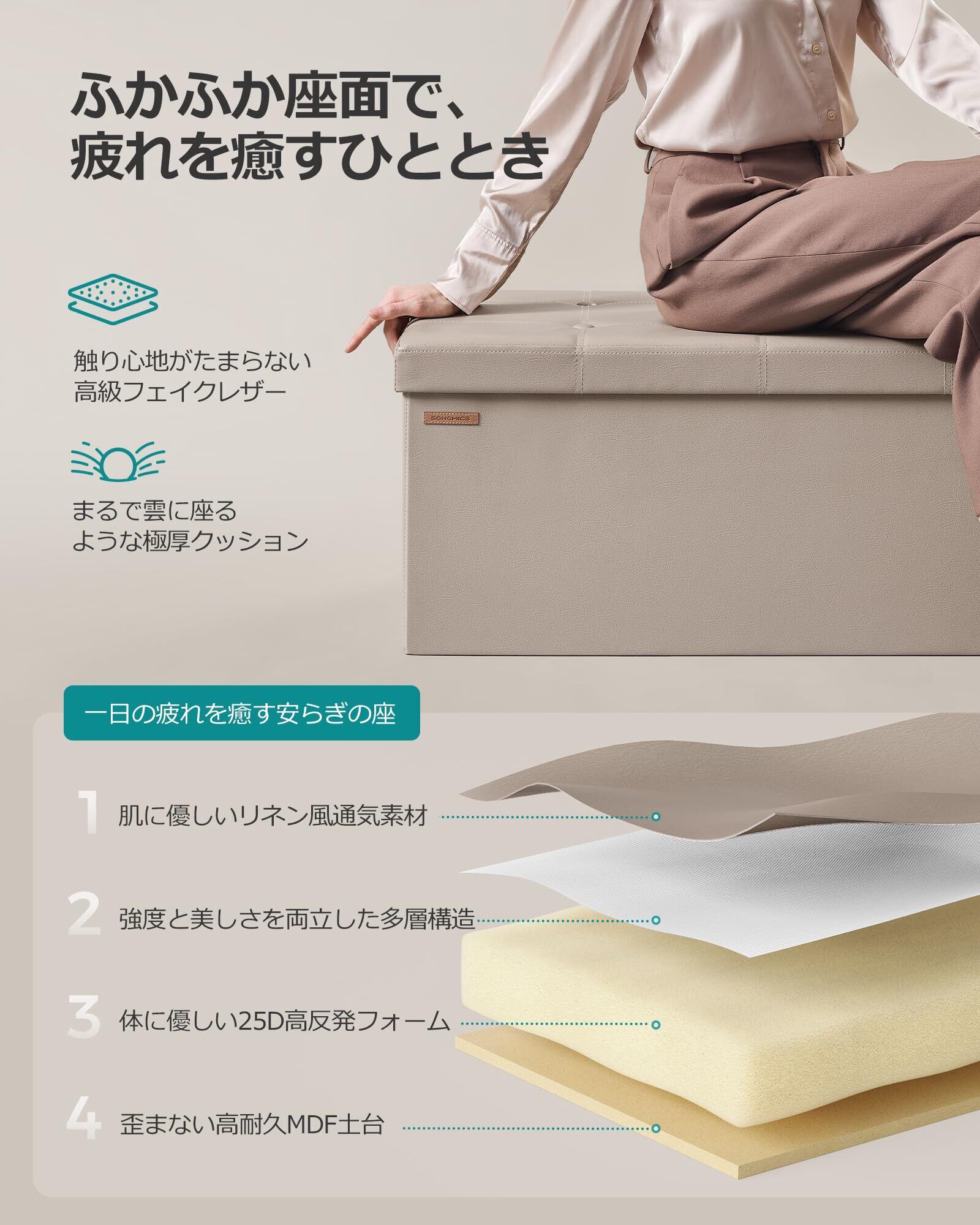 【簡単組み立て&収納】SONGMICS MAZIEコレクションの収納オットマンは折りたたみ式デザインを採用。底板を差し込むだけで数秒で組み立て可能。使用しない時は簡単に折りたたんでベッド下やクローゼットに収納できる省スペース設計です。 ご注意: 製品の材質により、開封時に特有のにおいがする場合がございます。風通しの良い場所で1~3日程度放置すると自然になくなりますので、予めご了承ください。