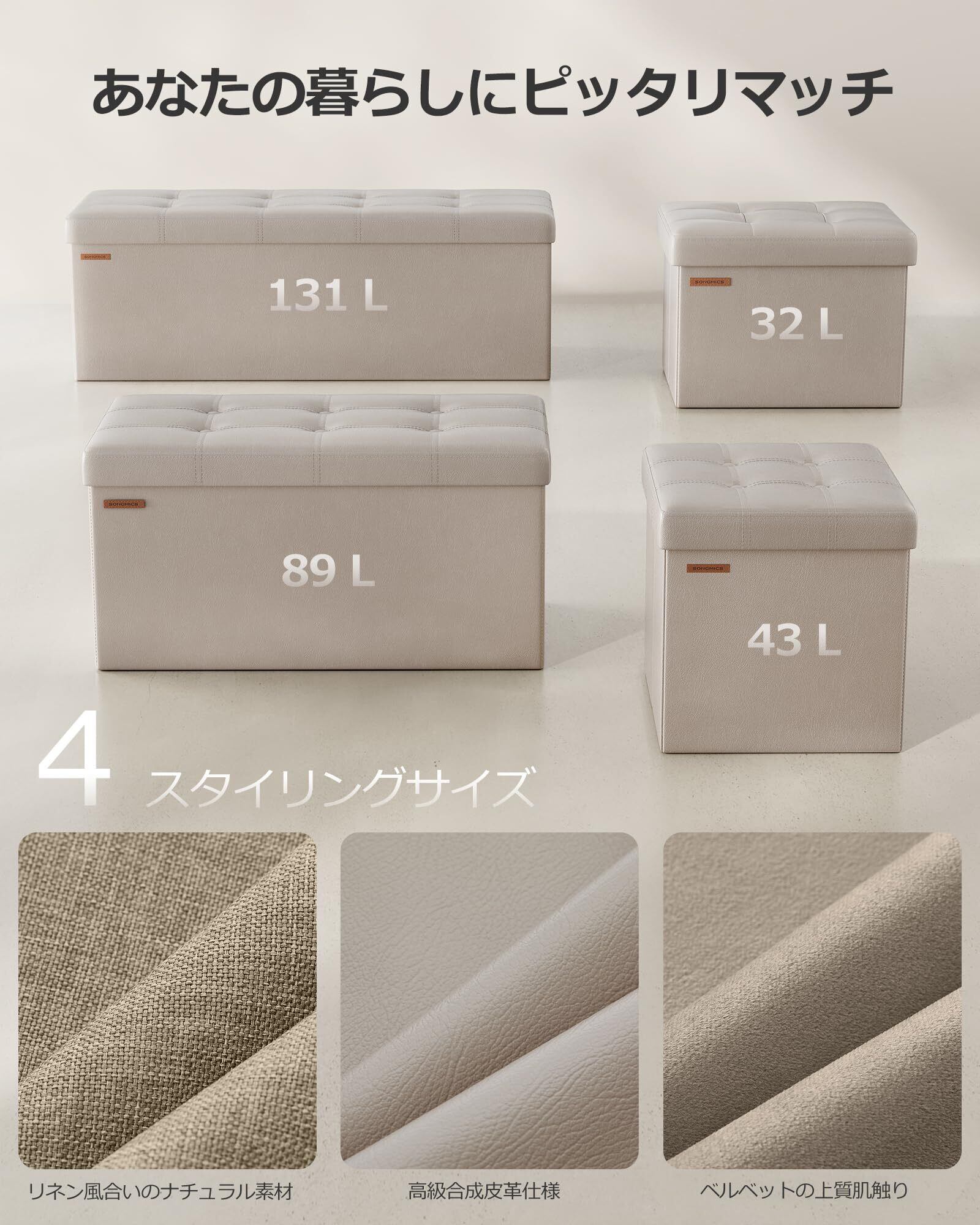 大容量の収納スペースを内蔵しており、ブランケットや雑誌、その他小物をすっきりと収納可能です。広々とした43インチのサイズは、座ったり足を置いたりするのに余裕があり、使い方も多様です。折りたたみ式ですので、使わない時にはコンパクトに収納できます。