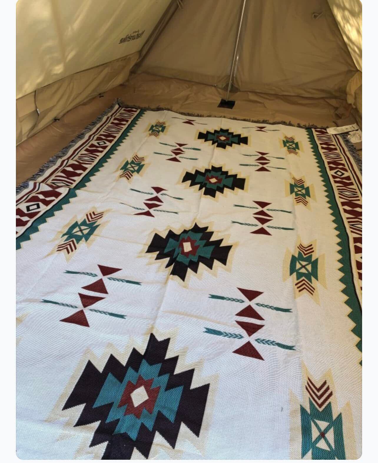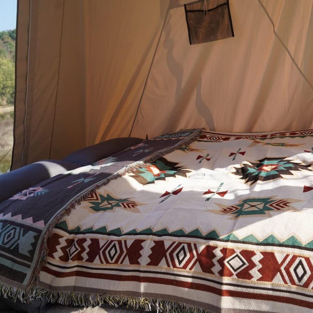 ネイティブ柄の色使いやオルテガ柄の独特な模様が、どんな場所でも注目を集めます。アウトドアイベントやバンライフにぴったりなだけでなく、お部屋のインテリアにアクセントを加えるアイテムとしても最適です!