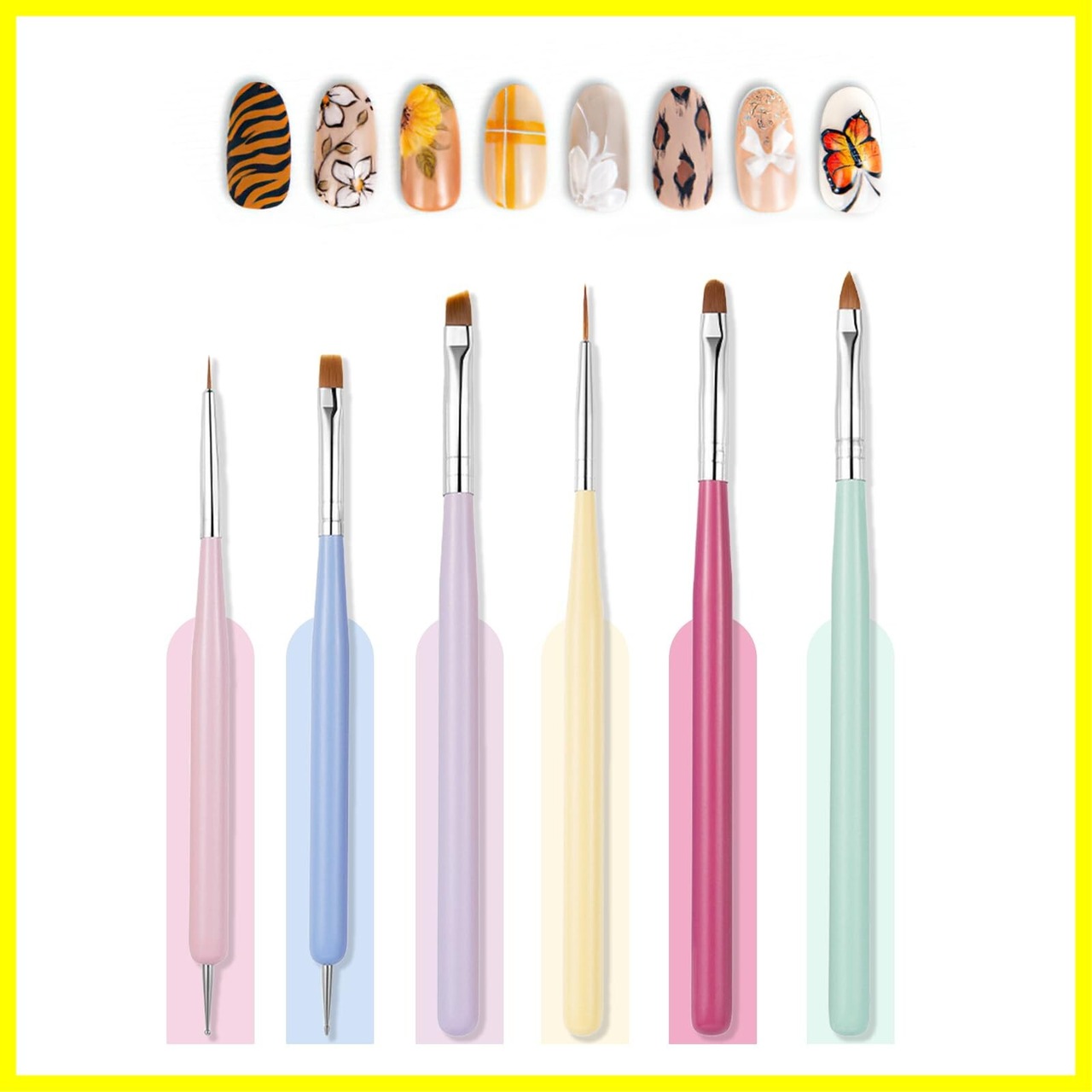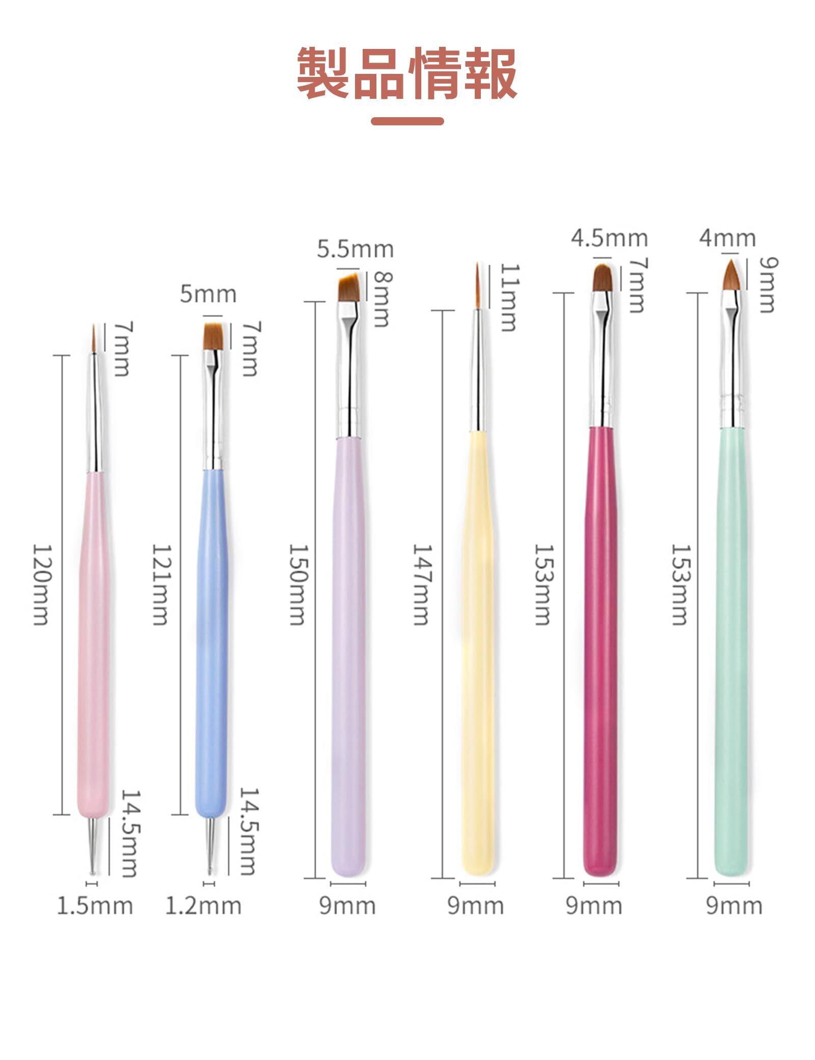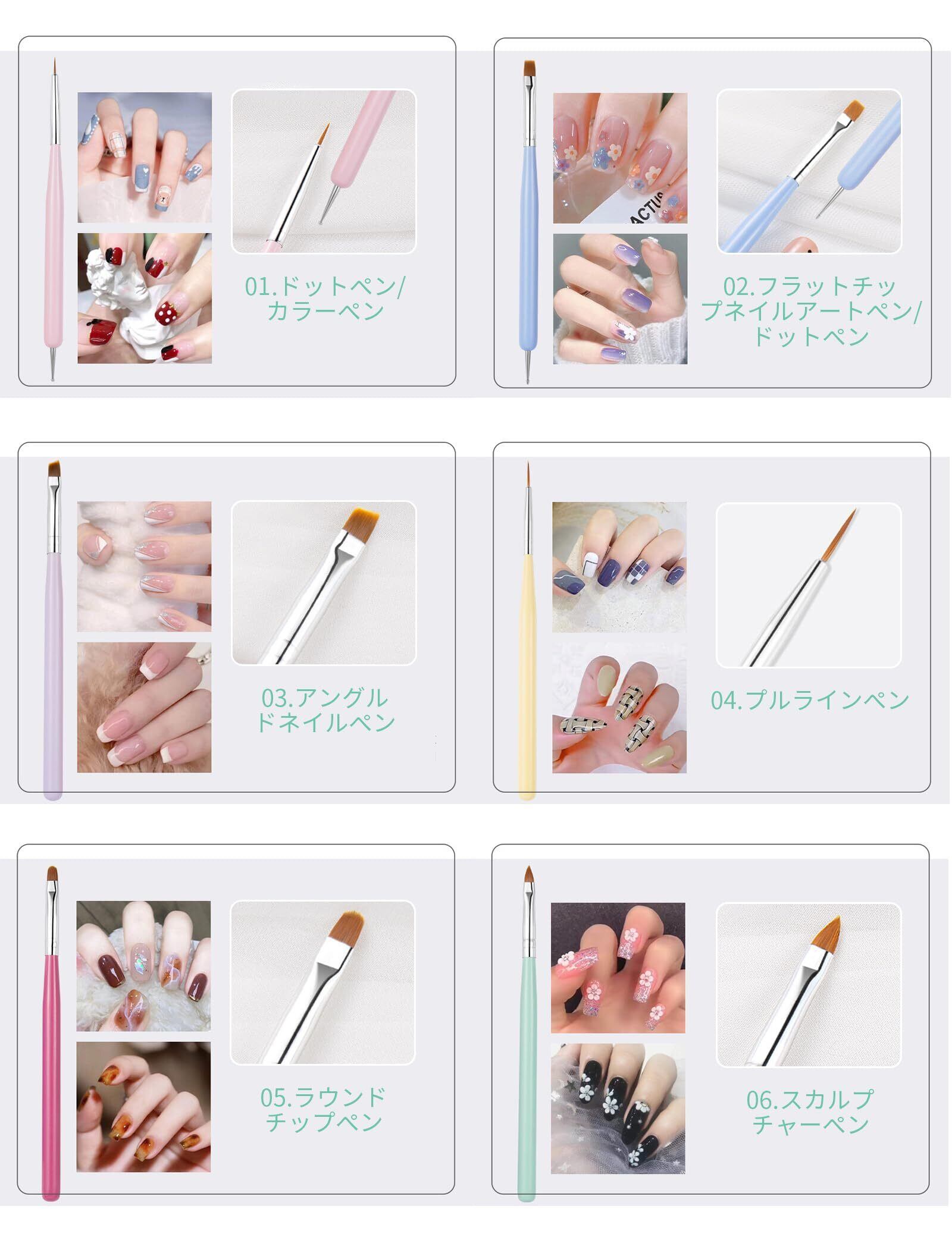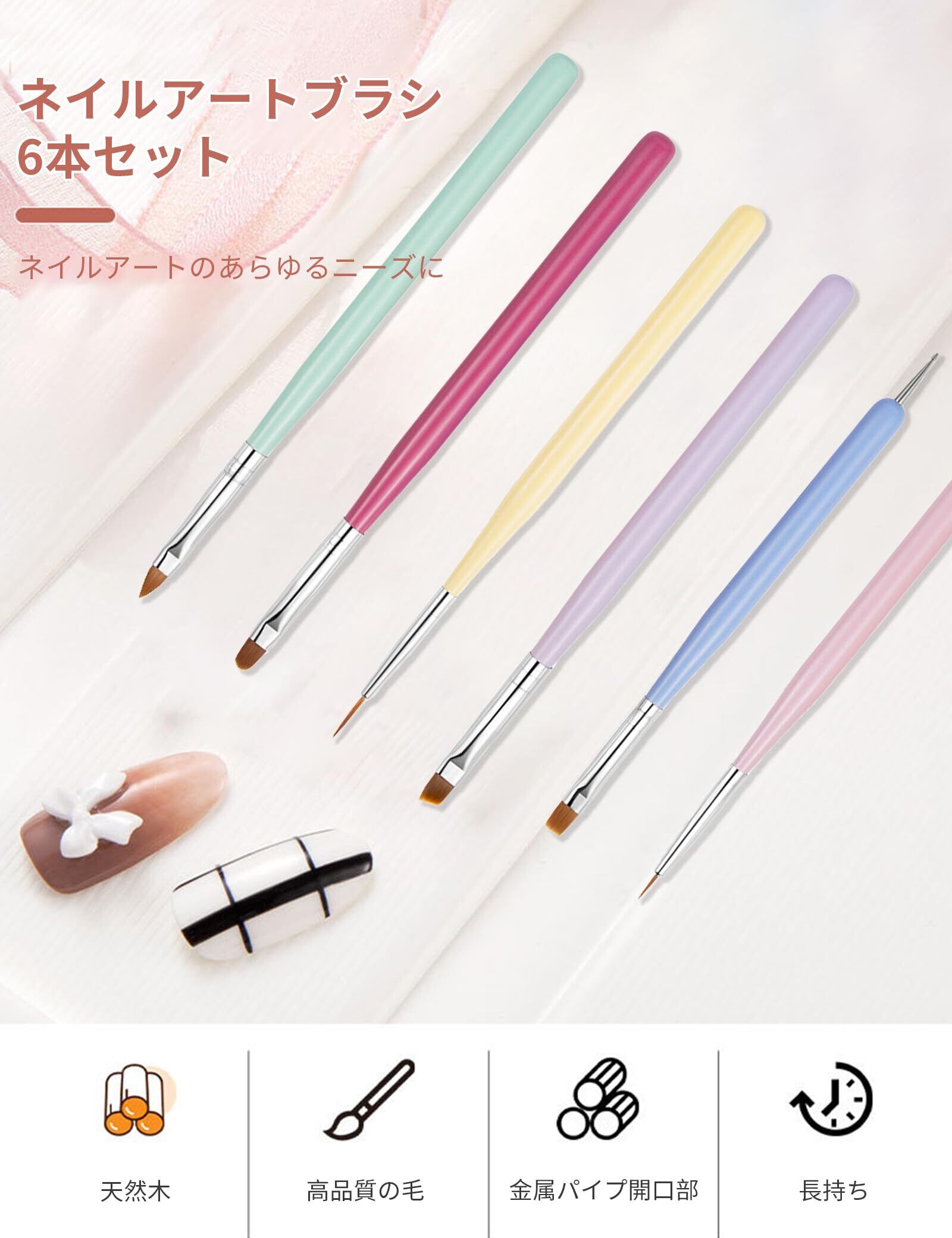 【商品内容】6種類のネイルアートブラシがセットになっています。 ネイルアート初心者がまず揃えるべきアイテムです。ブラシの形も7種類あり、お気に入りのネイルアートデザインが簡単に作れます! また、ドットペンが大小1本ずつ入っています。