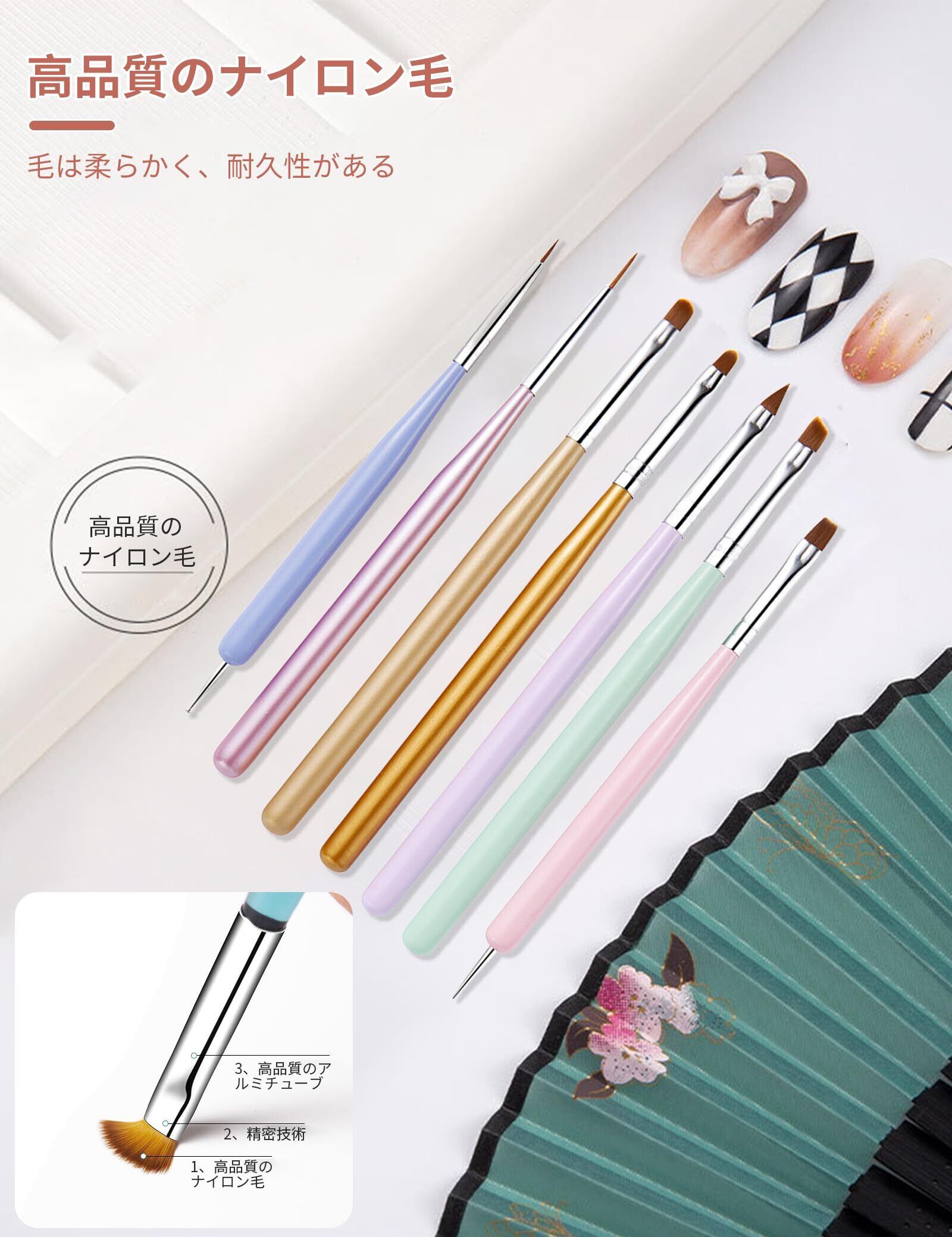 マルチカラーの6本セットには、様々な太さのブラシが揃っており、細かいディテールから大胆なアートまで幅広く対応可能です。大小ドットペンも付属しており、ドットアートやパターン作りに最適です。あなたのネイルアートを一層華やかに演出します!