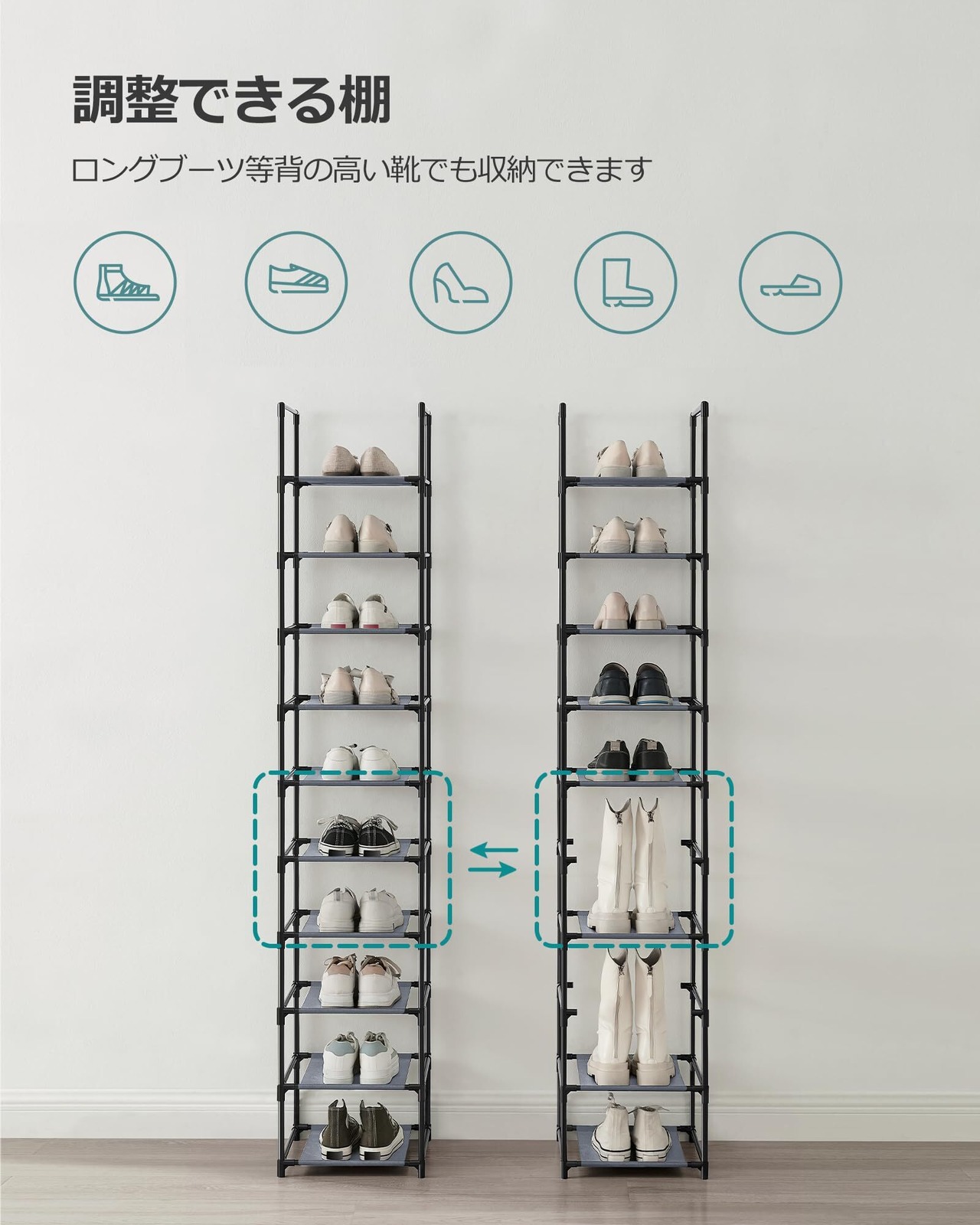 丈夫な素材を使用しており、安定した収納が実現。靴をしっかり支える構造で、安全に保管できます。お気に入りの靴をすぐに取り出せるので、毎日の準備がスムーズになります。