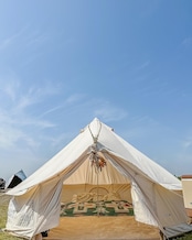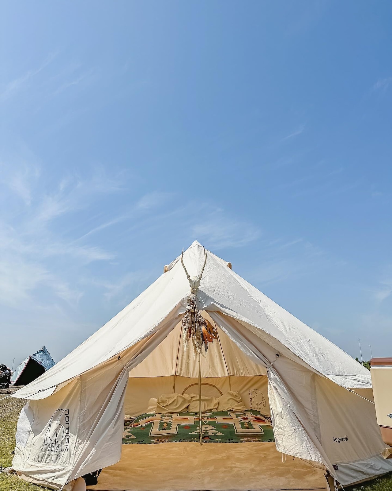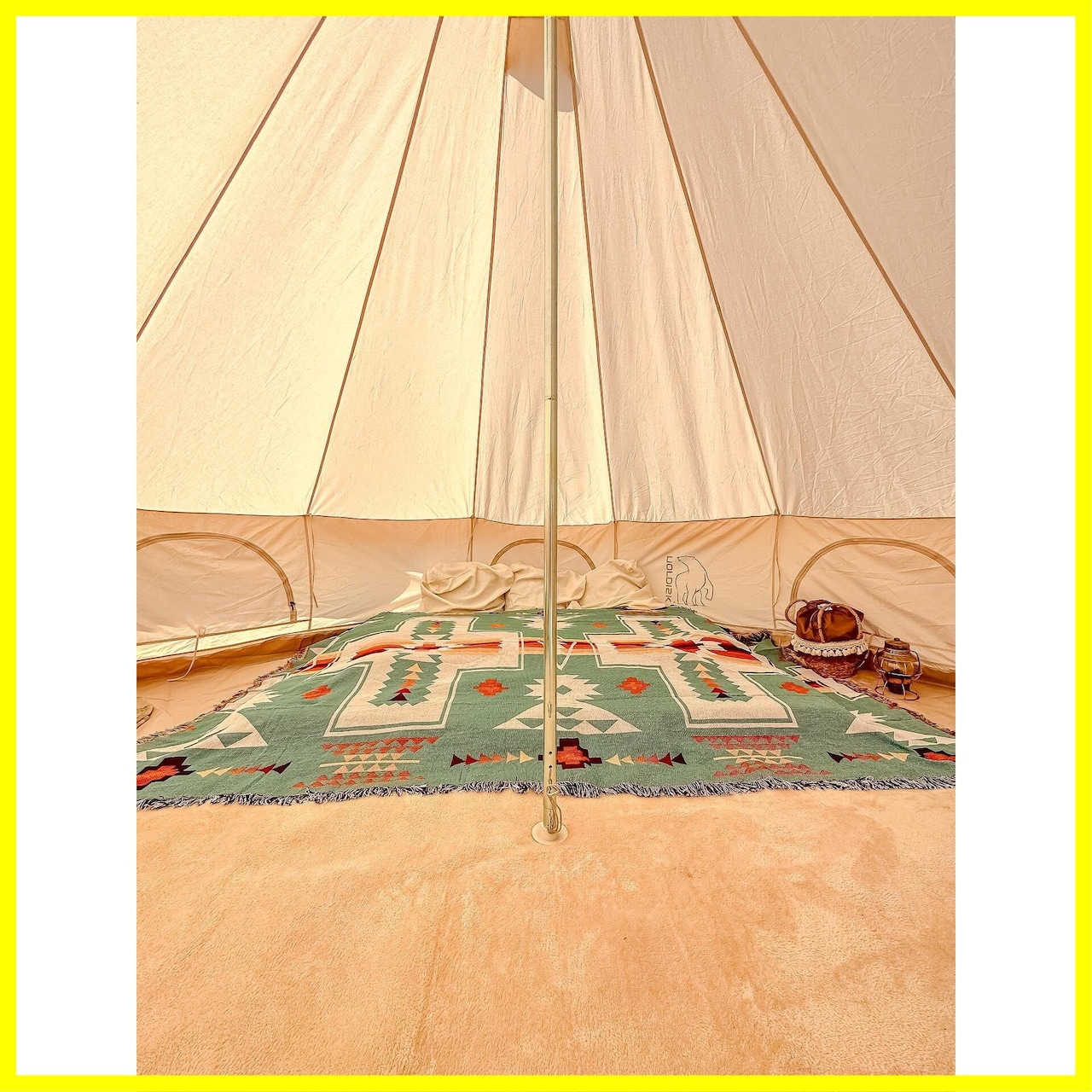 大判のメキシカンラグをコットの上に敷くだけで、まるで先住民が生活しているような空間に。ナチュラルな色あいのテントやテーブルに、メキシカンラグの派手めなデザインがマッチしています。