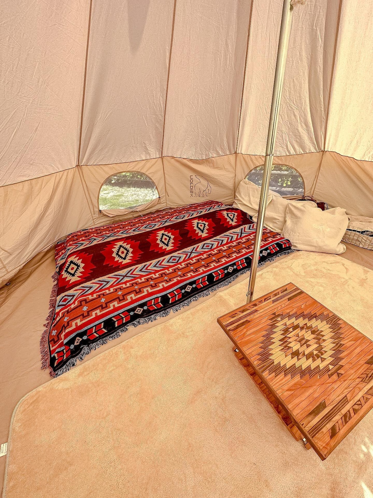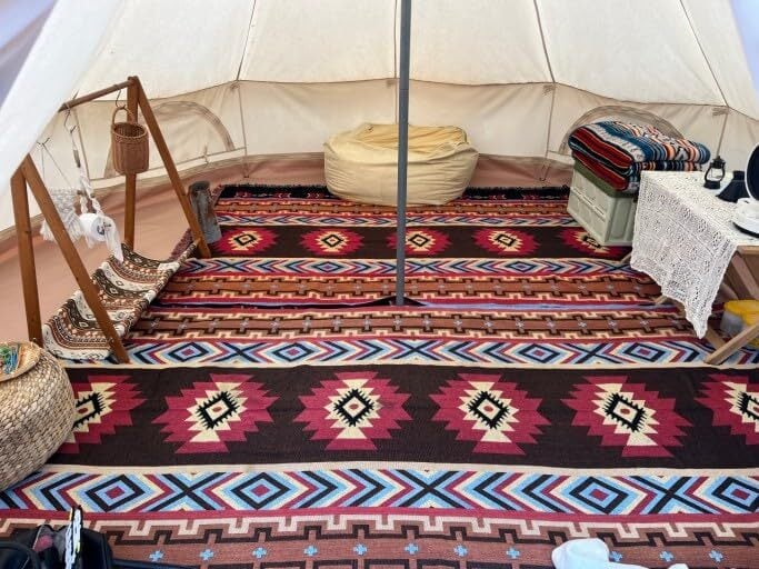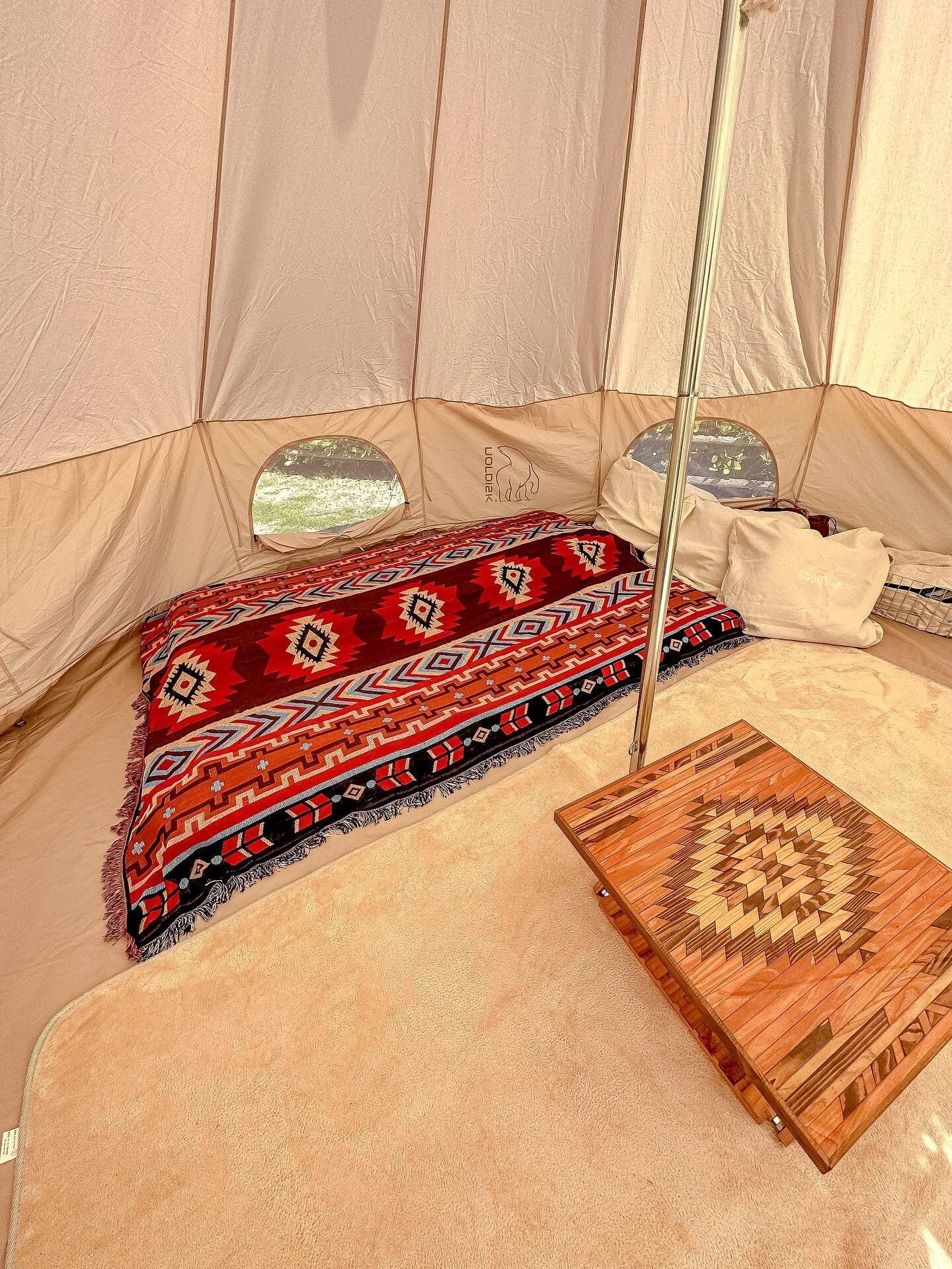 大判のメキシカンラグをコットの上に敷くだけで、まるで先住民が生活しているような空間に。ナチュラルな色あいのテントやテーブルに、メキシカンラグの派手めなデザインがマッチしています。