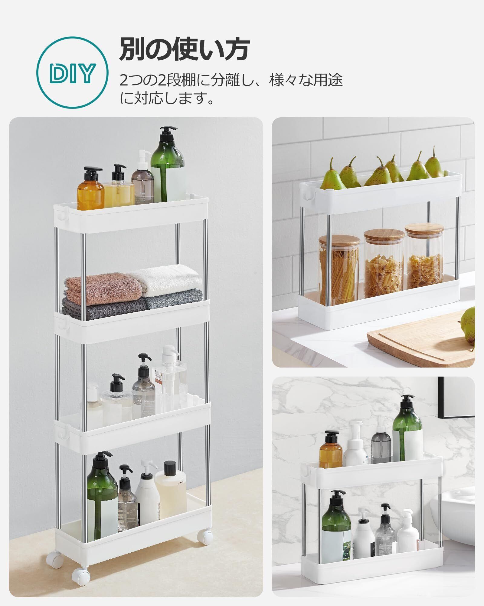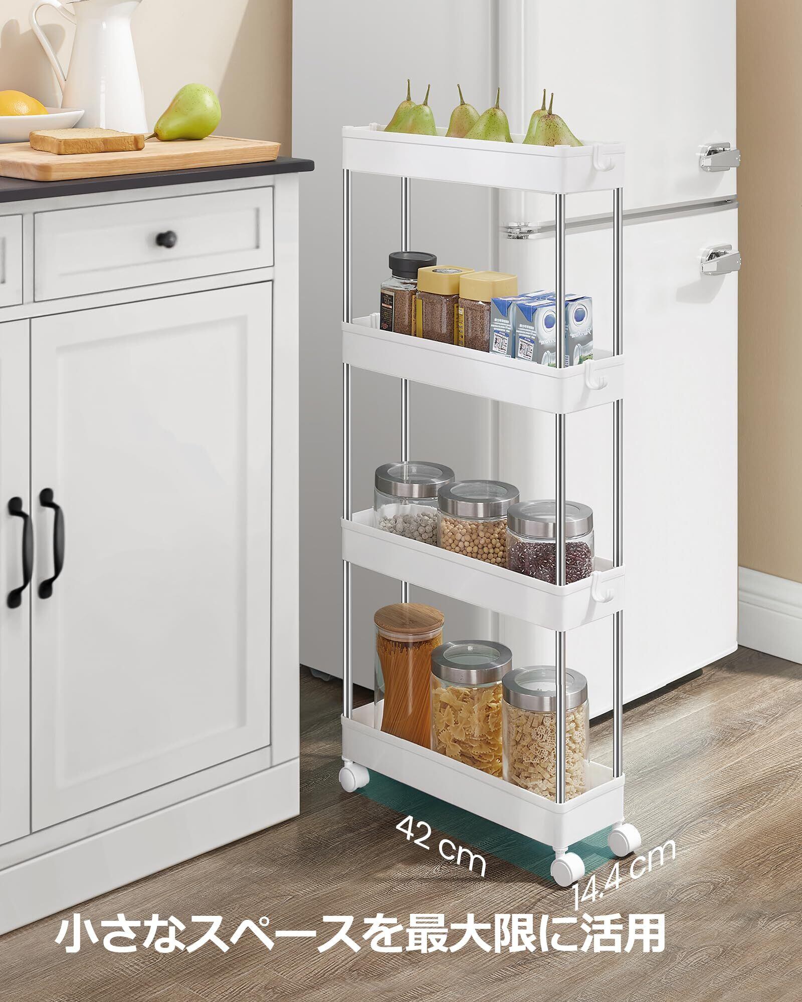 SONGMICS キッチンワゴン キッチンラック キャスター付き スリム キッチンカート 4段 すき間収納 隙間ワゴン 幅14.4cm キッチン収納 作業台 スリム キッチン コンパクト 収納 コスメ収納ワゴン 台所 洗面所 洗濯室 14.4 x 42 x 86 cm ホワイト KSC08WTV1