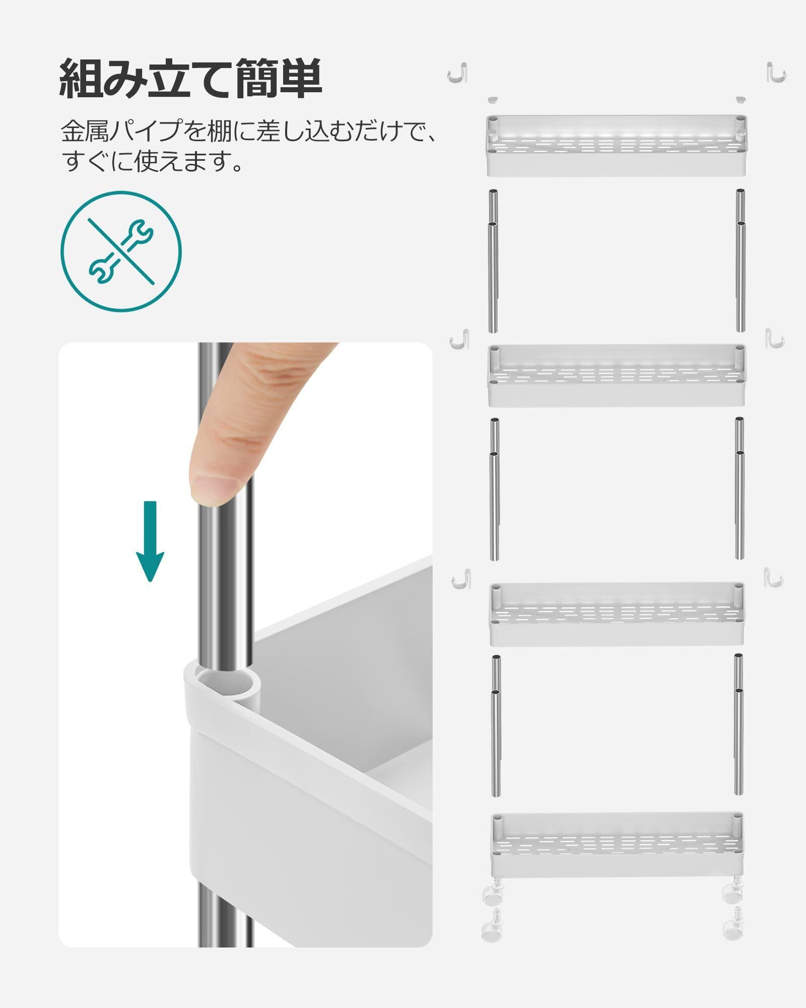 奥行き4.9インチ x 幅15.7インチ x 高さ34.6インチのコンパクトなサイズで、丈夫なステンレススチールチューブで支えられた高品質のポリプロピレン(ポリプロピレン)棚4枚。この車輪付き可動棚には、まだ適切な場所が見つからないものすべてを収納できます。 バスルームのボディケア製品、キッチンのスナックパック、オフィスの書類など、この省スペースカートはすぐにワンストップソリューションになります。