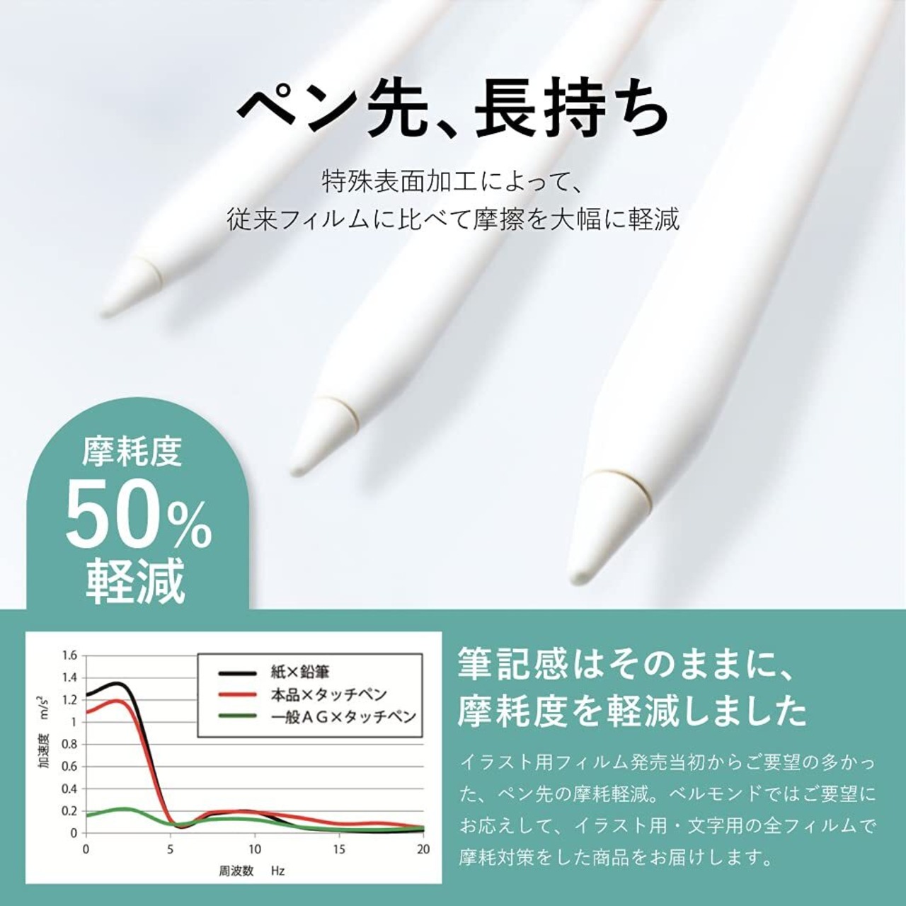 【BELLEMOND「紙感覚」とは】:紙感覚はBELLEMONDが2019年より販売している日本国内製造ペーパータイプフィルムです。紙と鉛筆を使った時のような摩擦係数を追求し、紙のような描き心地を再現しています。iPadをキャンバスにしてイラストを描く、学校でのノート代わりに使う等、iPadをもっとクリエイティブに使うためのフィルムです。
