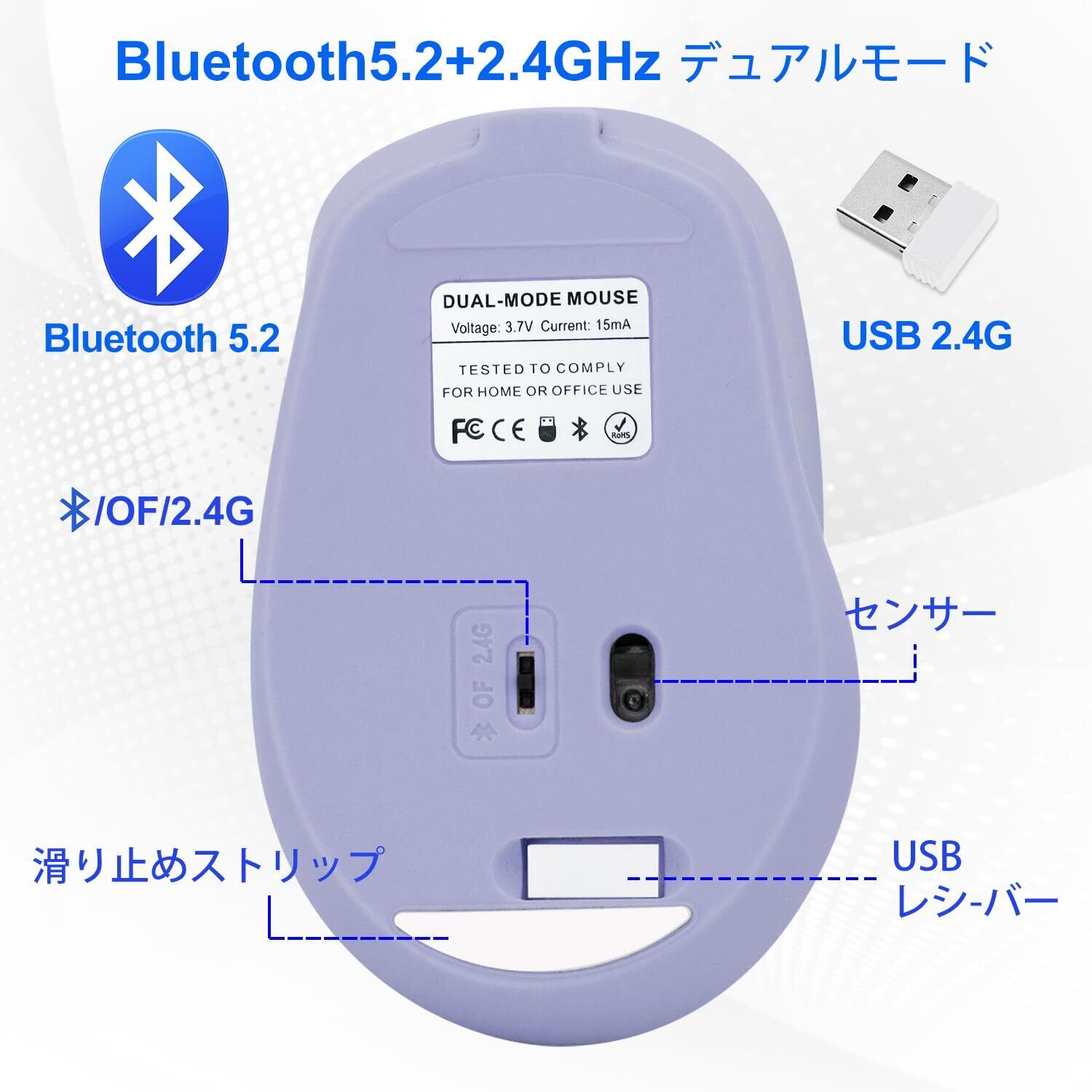 ワイヤレスマウス Bluetooth 5.2 静音 無線 マウス Type-C充電式 3段階DPI切替 2.4GHz 光学式 Mac Windows Android iOS iPad PC Macbook対応 (Purple-パープル)