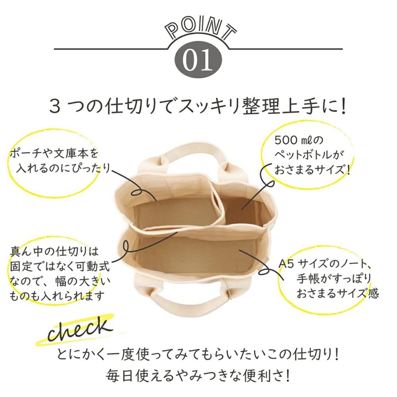 サプライズ:3つの仕切りと2つのポケットでスッキリ収納できるミニトートバッグ。 仕切りがあるので荷物を綺麗に整理整頓して入れられます。見た目以上の収納力と機能性。