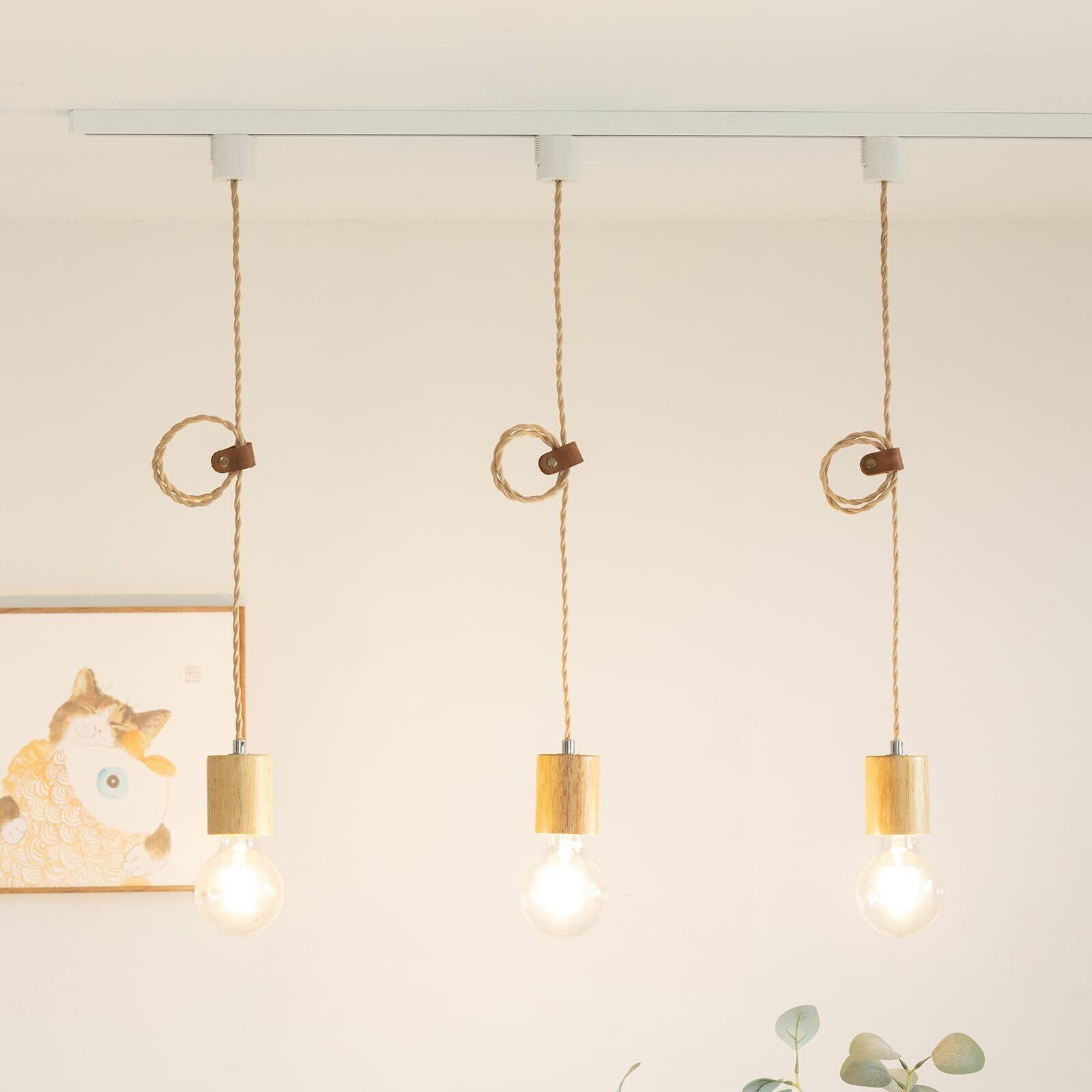 天然木 ペンダントライト 裸電球 E26口金ソケット ナチュラルカラー 吊り下げライト 本革コードホルダー付き 工事不要 (ダクトレール用・電球別売・3灯セット)