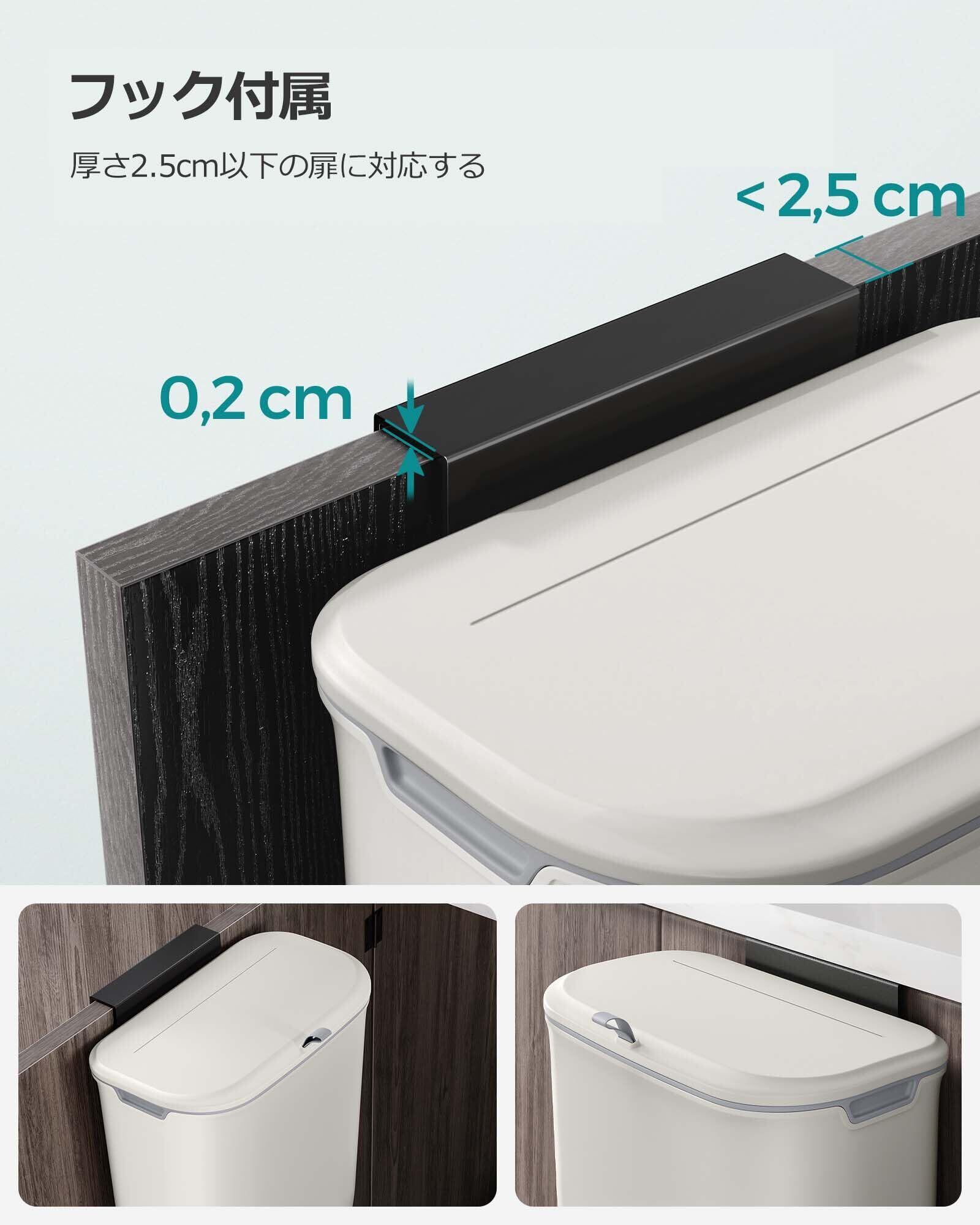 「スッキリとしたキッチン環境を実現!」:SONGMICSの吊り下げ式ダストボックスは、9Lのコンパクトな容量でありながら、使い勝手の良いデザインが特徴です。キッチンやバスルーム、オフィスなど、様々な場所で活躍します。スペースを有効活用し、手軽にゴミを処理できるので、日常のストレスを軽減します。