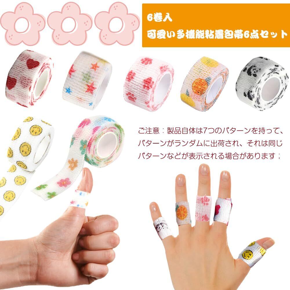 自己粘着性 伸縮包帯 6巻入 自着性テープ 弾性包帯 多機能 エラスチックバンデージ ペット 犬用 猫 指 手首サポート 粘着包帯 不織布凝集 通気性 耐水性 柔軟性 伸縮性強い 2.5cm x 4.5m 可愛い柄