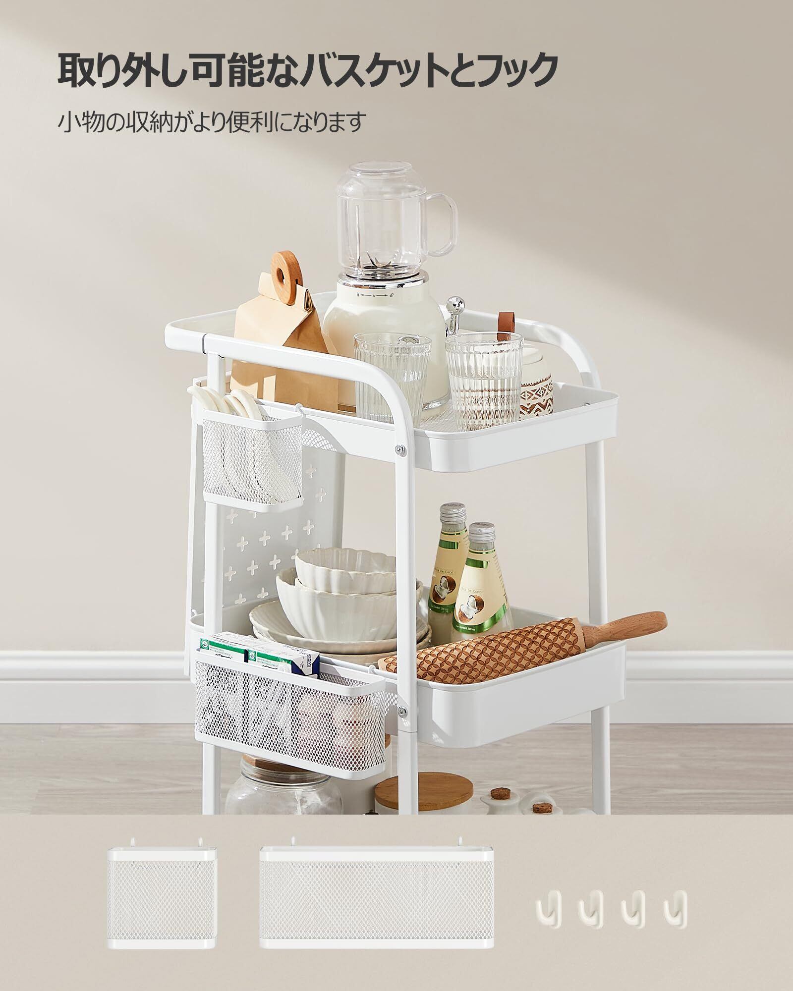 【追加の取り付け具付き】このカートには2つの金属製ハンギングバスケットと4つのフックが付属しており、ツールやその他の小物を整理し、整然と手の届くところに置くのに役立ちます。スペースをきれいに保つための理想的な選択肢です