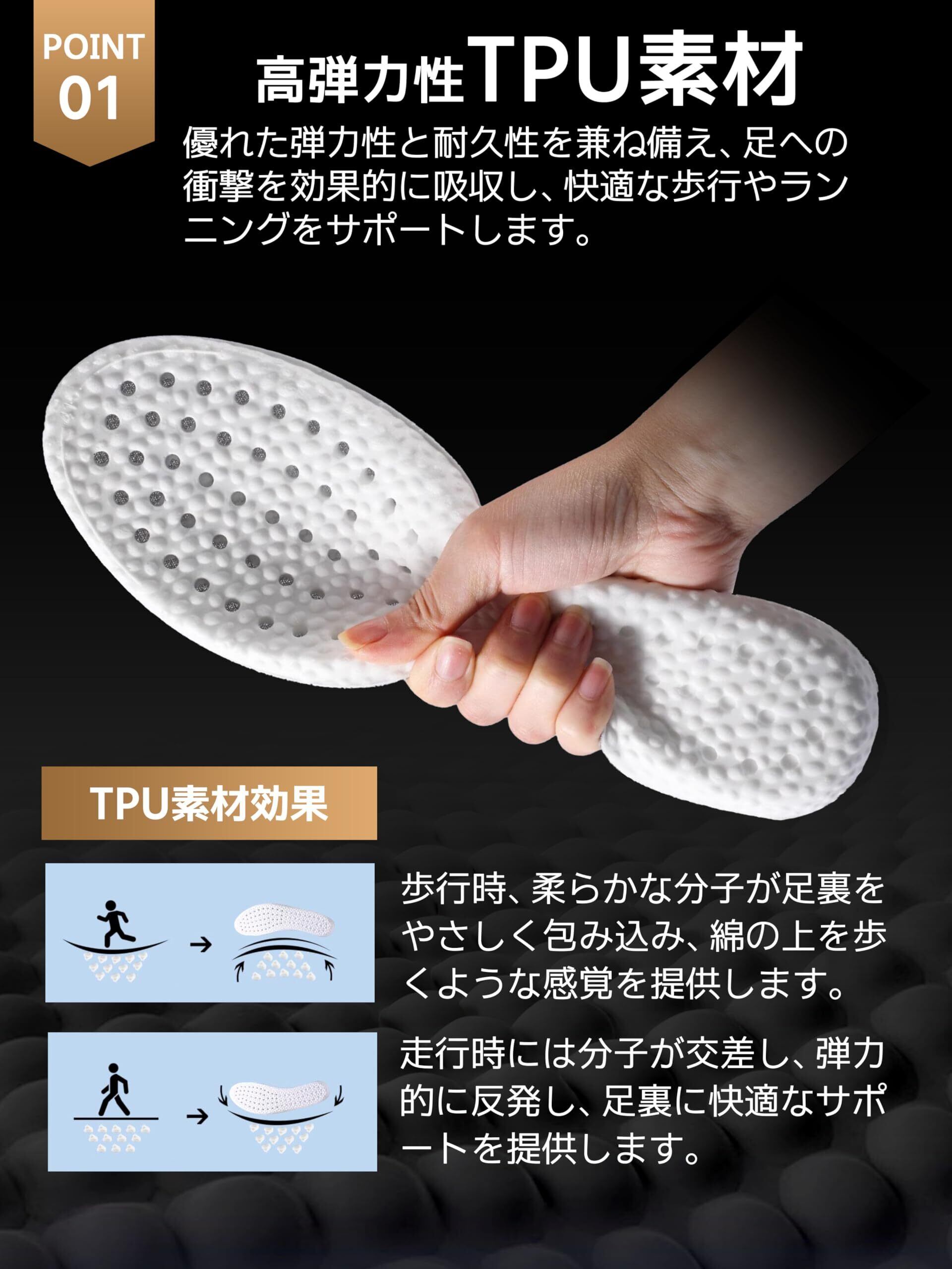 【衝撃吸収】衝撃吸収を高反発素材を全面に採用。特に衝撃がかかる踵だけでなく、足全体に高い衝撃吸収性と反発性を発揮し、ランニングやトラッキング、フィットネスジムでの運動など、アクティブなスポーツに最適な素材です。抜群のクッション性を実現しています。【衝撃吸収・疲労軽減】 表面に優しい履き心地のソフトクッション、裏面には衝撃吸収ジェルパッドを搭載、生卵を受け止められる衝撃吸収力に加え、疲労感を軽減する3Dサポートが、土踏まずを支えることで体圧を分散し足の疲れや痛みを軽減します