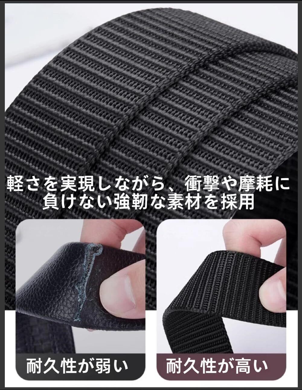 【素材構成】:ナイロン、プラスチックバックル(樹脂製POMバックル) 軽量良質ナイロンを使って、耐摩耗性高い、防水することができます。無段階調節フリーサイズ、自分の最適な位置に調整できます。 また、樹脂製バックルは軽量・高強度ポリアセタールを採用して、プラスティック製なので青錆びる心配もなくデザインもすっきりしてます。水に強く軽いので登山に最適です