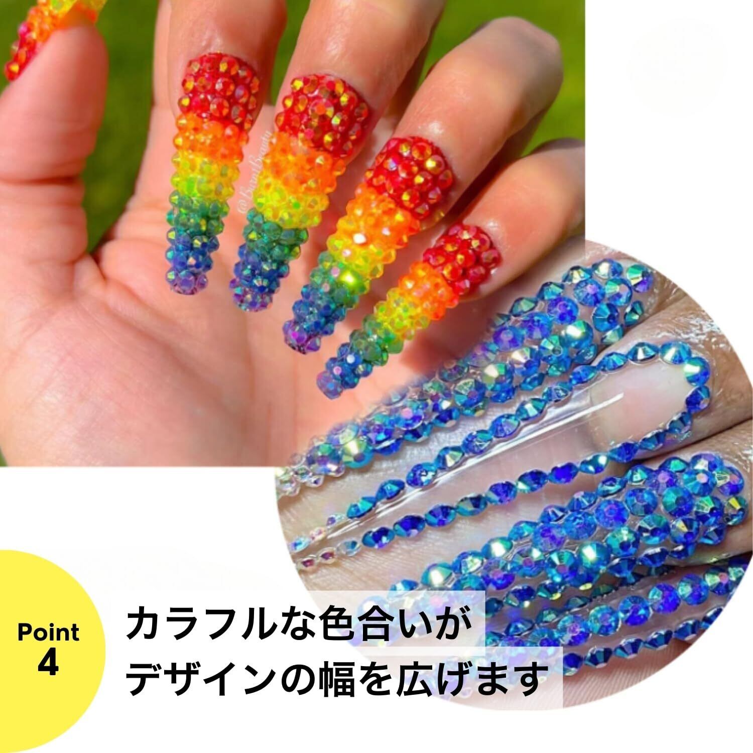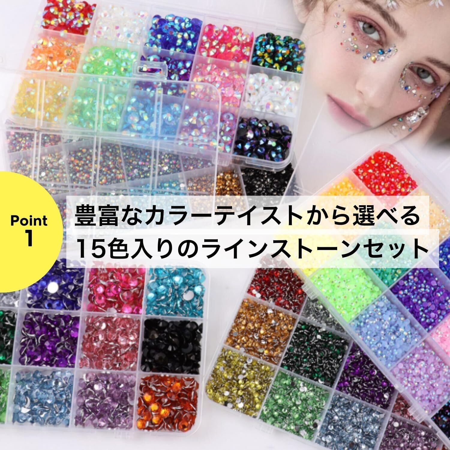 【サイズ・バリエーション】豊富なカラーテイストから選べる15色入りのラインストーンセット。ストーンサイズは3mm・4mm・5mm・6mmの4種類。高品質な樹脂製ラインストーンで、うちわ・ネイル・レジン・スマホデコなど多用途に対応。