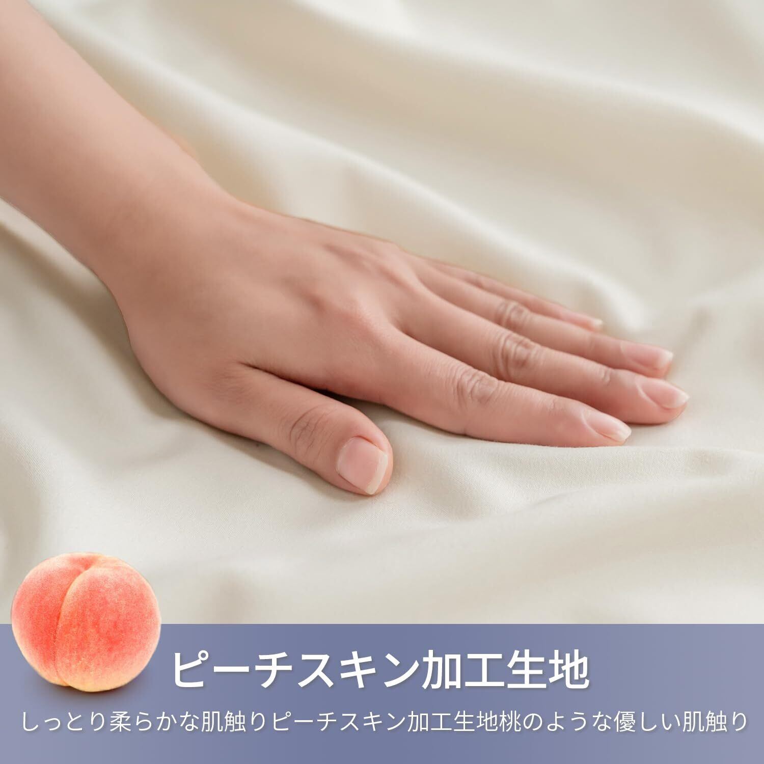 <ピーチスキン加工>:柔らかい磨き再生繊維(ポリエステル100%)を採用したpillow caseに、ピーチスキン加工を施しています。ソフトな起毛とサラっとした肌触りで、快適な寝心地を実現。