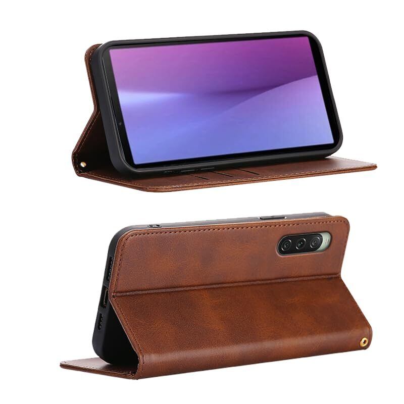 「スタイリッシュで機能的、Xperia 10 V 用の手帳型ケース!」:本商品は、エクスペリア10 V SOG11 / SO-52Dにぴったりの手帳型ケースです。ダークブラウンの落ち着いたデザインは、どんなシーンにも合わせやすく、持つ人のセンスを引き立てます。上質なPUレザーを使用し、高級感が漂います。