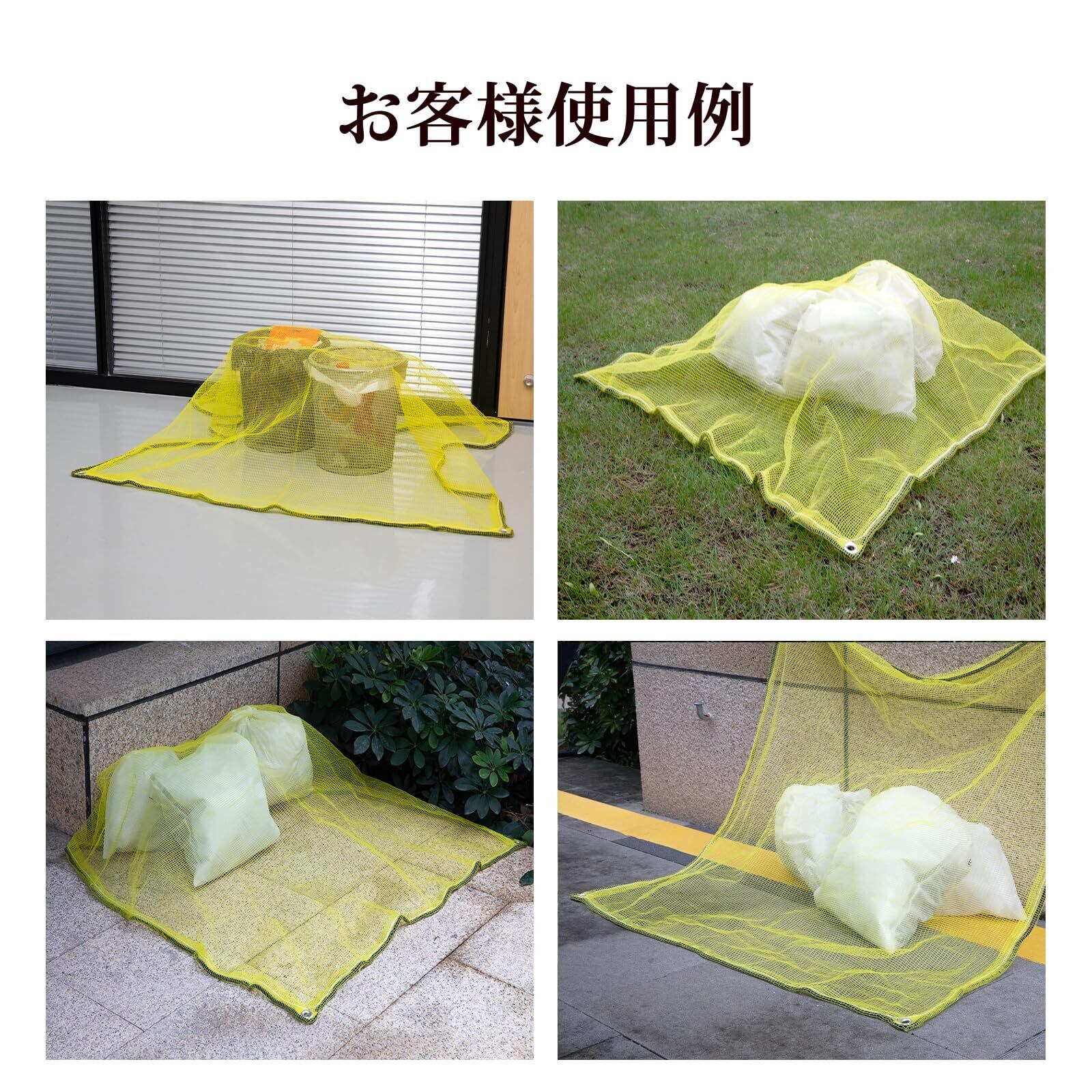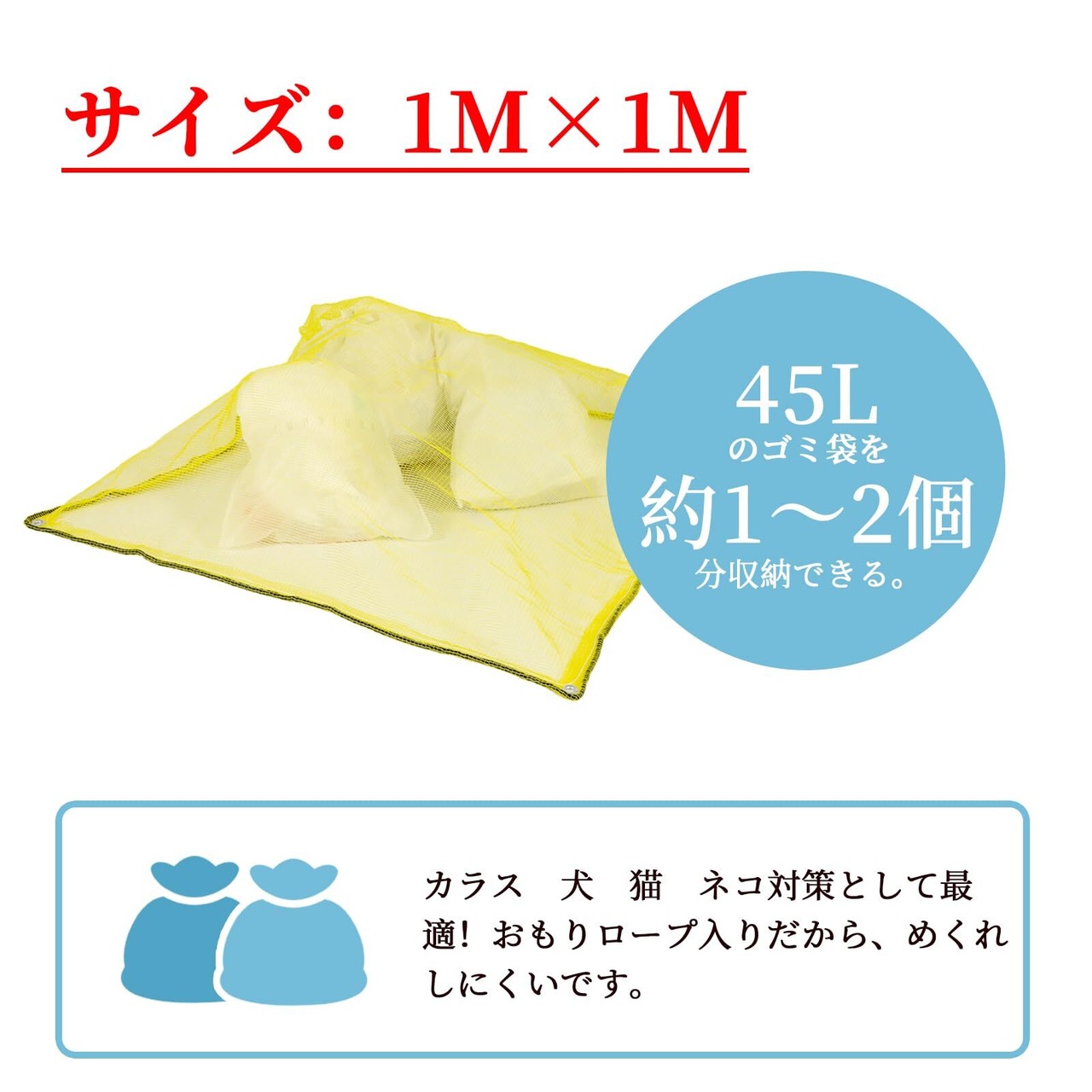 [商品仕様] サイズ:1m×1m 目安:45Lのゴミ袋が約2袋入ります。 (ゴミ袋の大きさやごみの量によって収納目安は変わる可能性がございます) 網目:4㎜ 材質:耐候性ポリエチレン