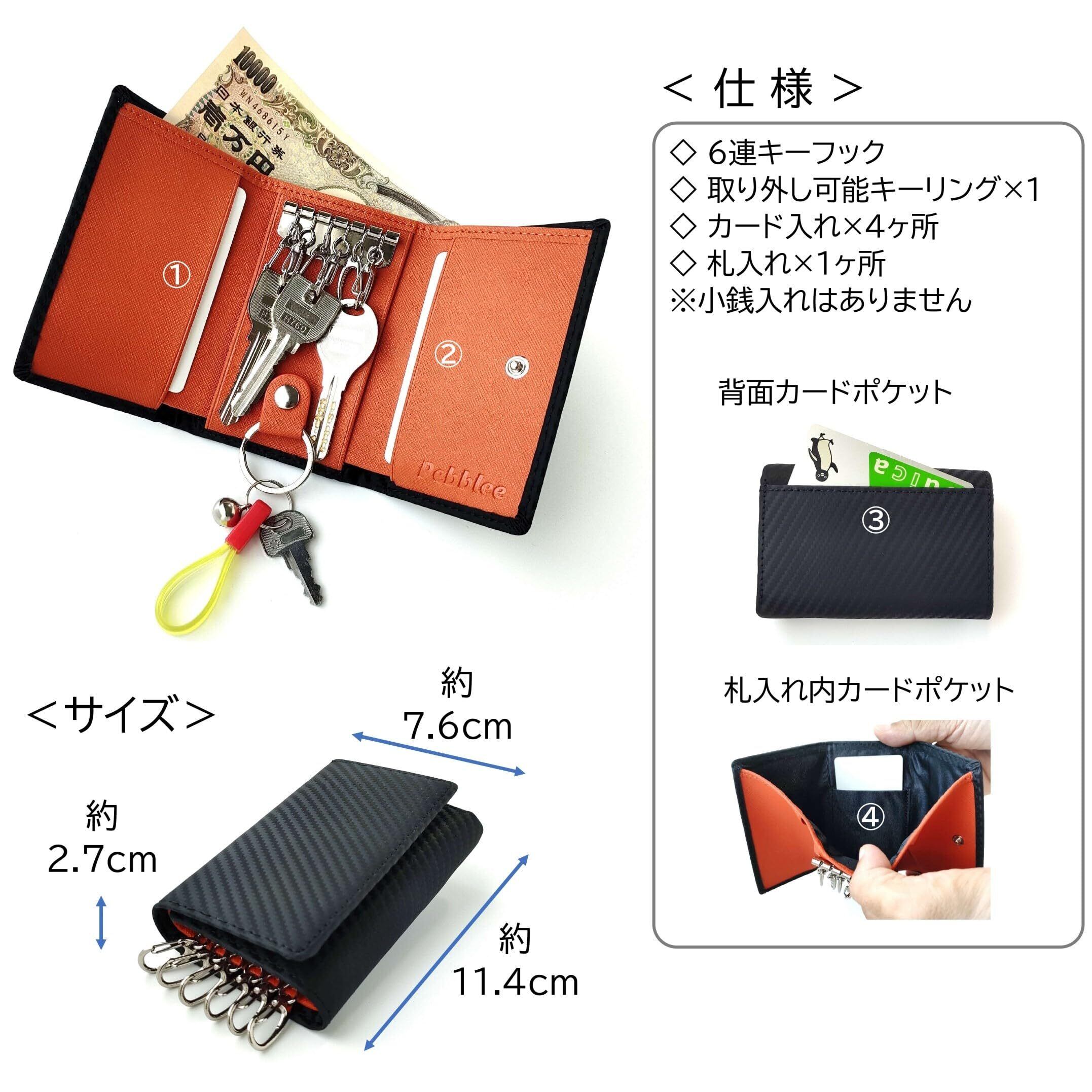 [Pebblee] キーケース メンズ カード 定期 財布 6連 カーボンレザー 取外しキーリング付(ブラック×オレンジブラウン)