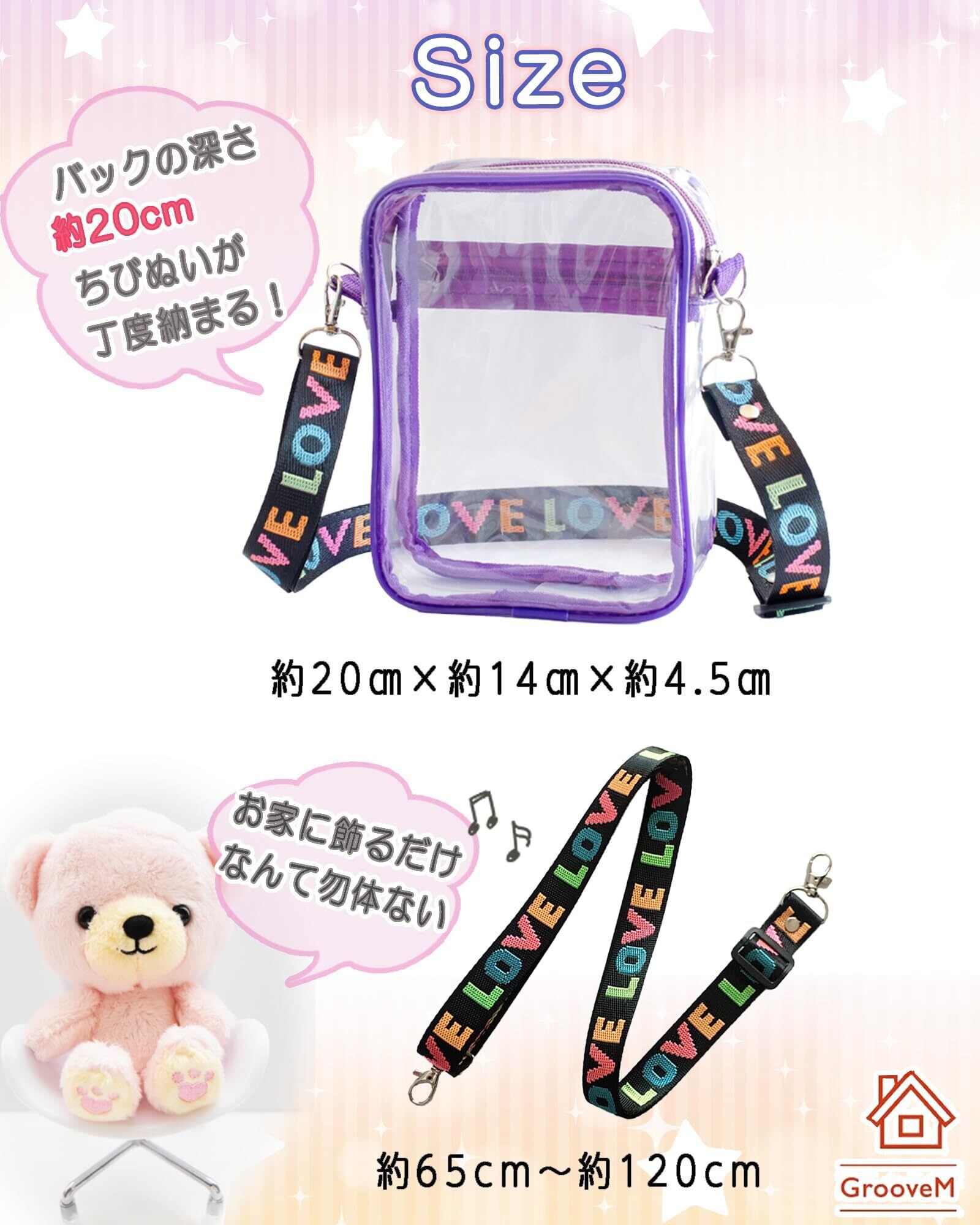 クリア仕様なので、ぬいぐるみやバッジ、写真など見せたいアイテムを入れて楽しむことも◎収納力抜群!ショルダーストラップは取り外し可能。