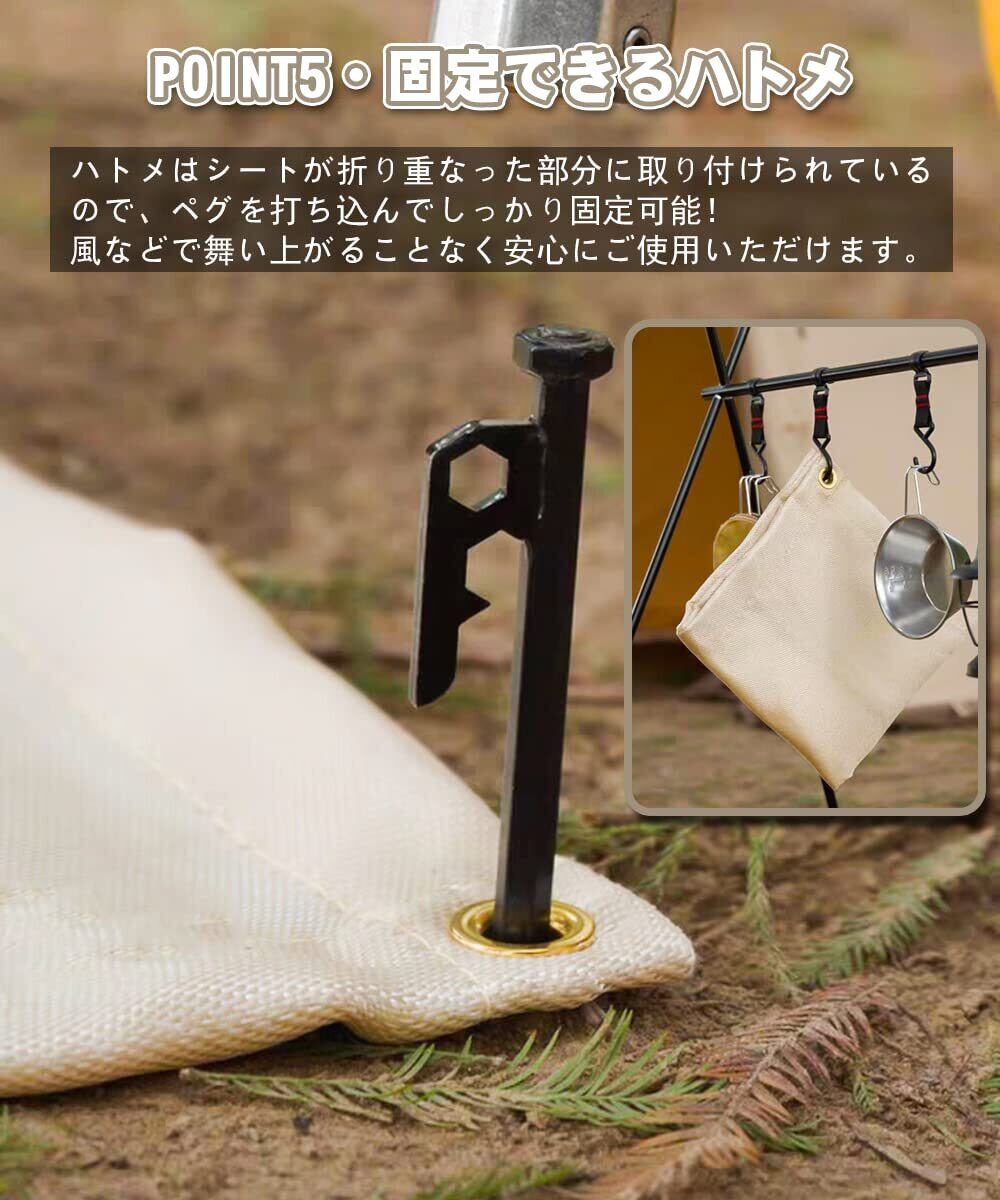 【丈夫で便利なハトメ】シートが折り重なった四隅にハトメをしっかりとカシメた頑丈な設計となっており、ハトメが外れる心配はありません。強風の日でも、ペグを使って焚き火台シートを地面に固定することで、風などによる舞い上がりを防ぎ、安全にご使用いただけます。(ペグは別売りです。)