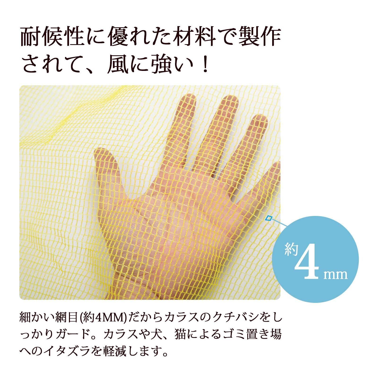 [商品仕様] サイズ:1m×1m 目安:45Lのゴミ袋が約2袋入ります。 (ゴミ袋の大きさやごみの量によって収納目安は変わる可能性がございます) 網目:4㎜ 材質:耐候性ポリエチレン