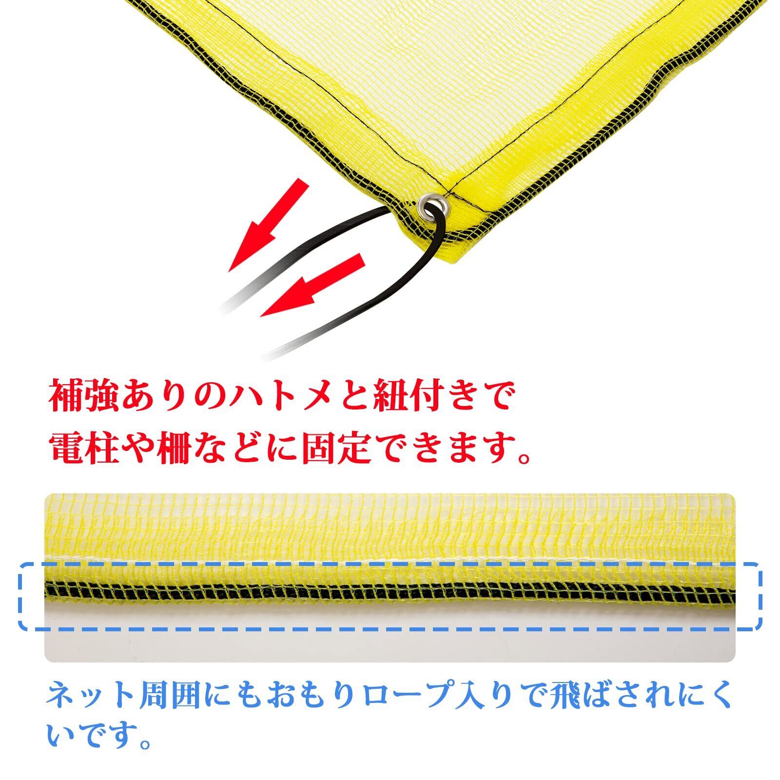 [飛ばされない] 補強ありのハトメと紐付きで電柱や柵などに固定できます。ネット周囲にもおもりロープが入っているので風に煽られにくいです。