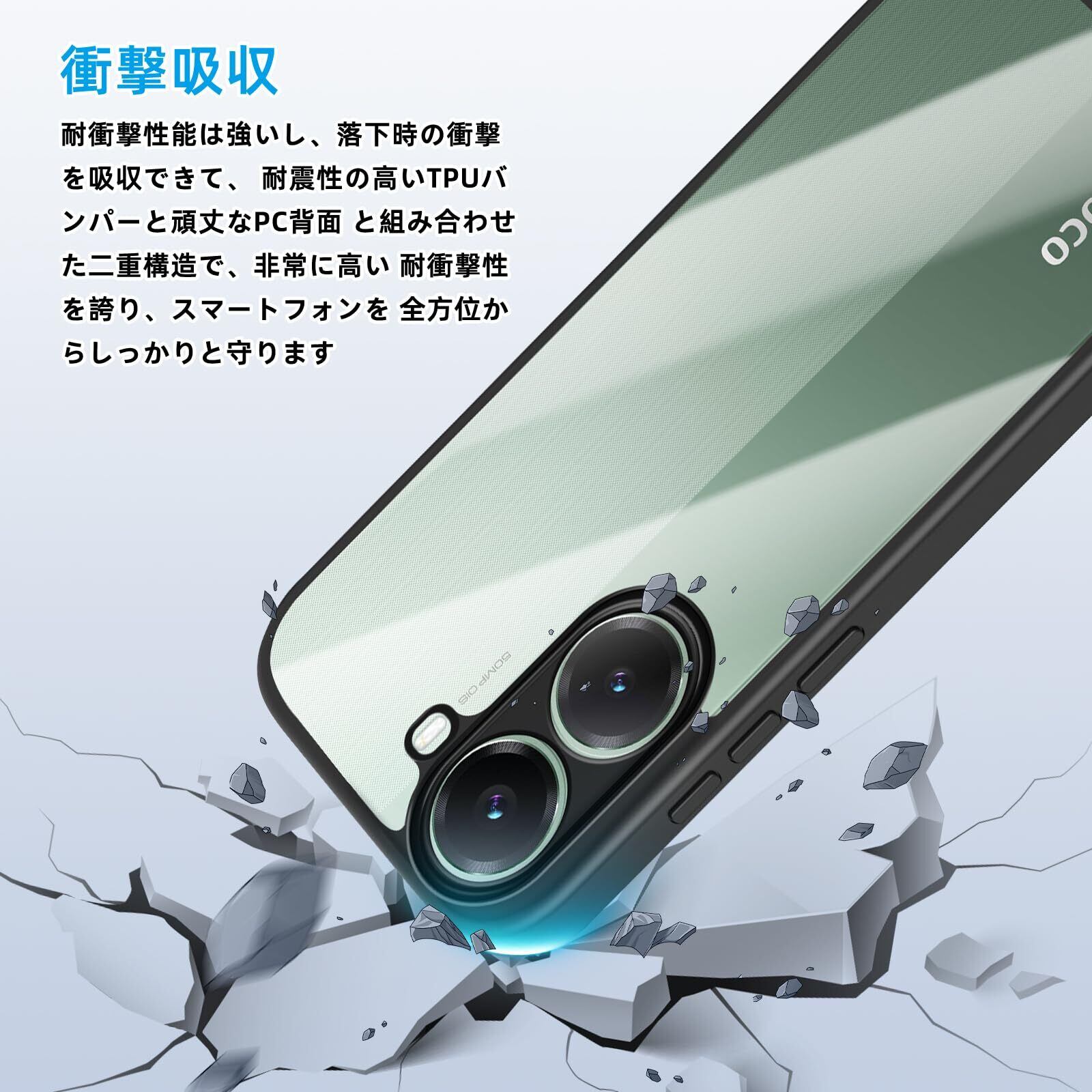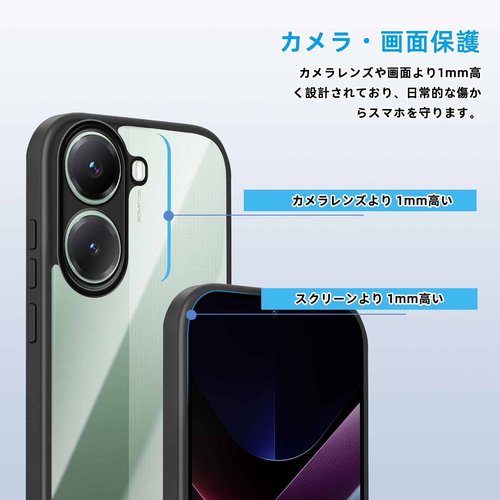 【スクリーンとカメラの保護】カメラ全体を傷から完全に保護するフルカバーカメラデザインが特徴です。保護ケースは装着時にカメラより1mm高く、傷を防ぎます。ケースの端はわずかに盛り上がっており、平らな面でカメラやスクリーンが擦れたり傷ついたりするのを防ぎます。柔軟な TPU と衝撃吸収保護コーナーを組み合わせて、落下やその他の衝撃から携帯電話を確実に保護します。