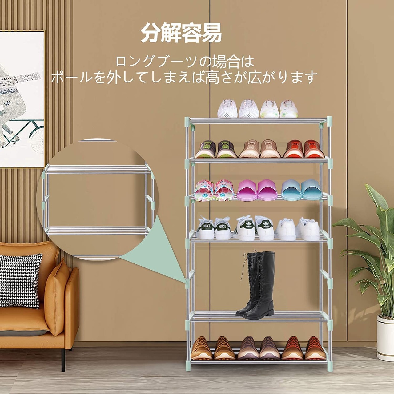【スタッキング可能と分解容易】組立式なので、分解、再構成が簡単です。複数のシューズラックを積み重ねると収納力もアップ。ロングブーツの場合は、ポールを外してしまえば高さが広がります。