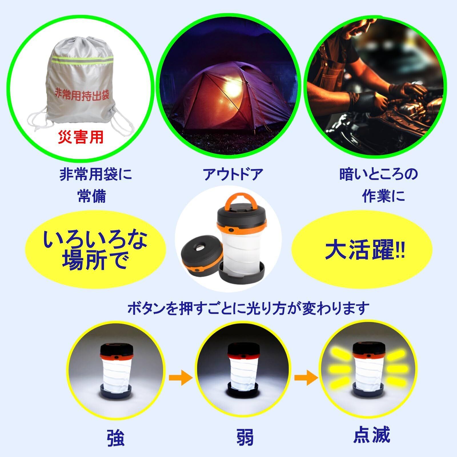 折り畳み式ランタンはボタン1つで3パターンの点灯モードに切り替えが可能。普通の明るさ、やさしい明るさ、点滅、ボタンを押すごとに切り替わります。