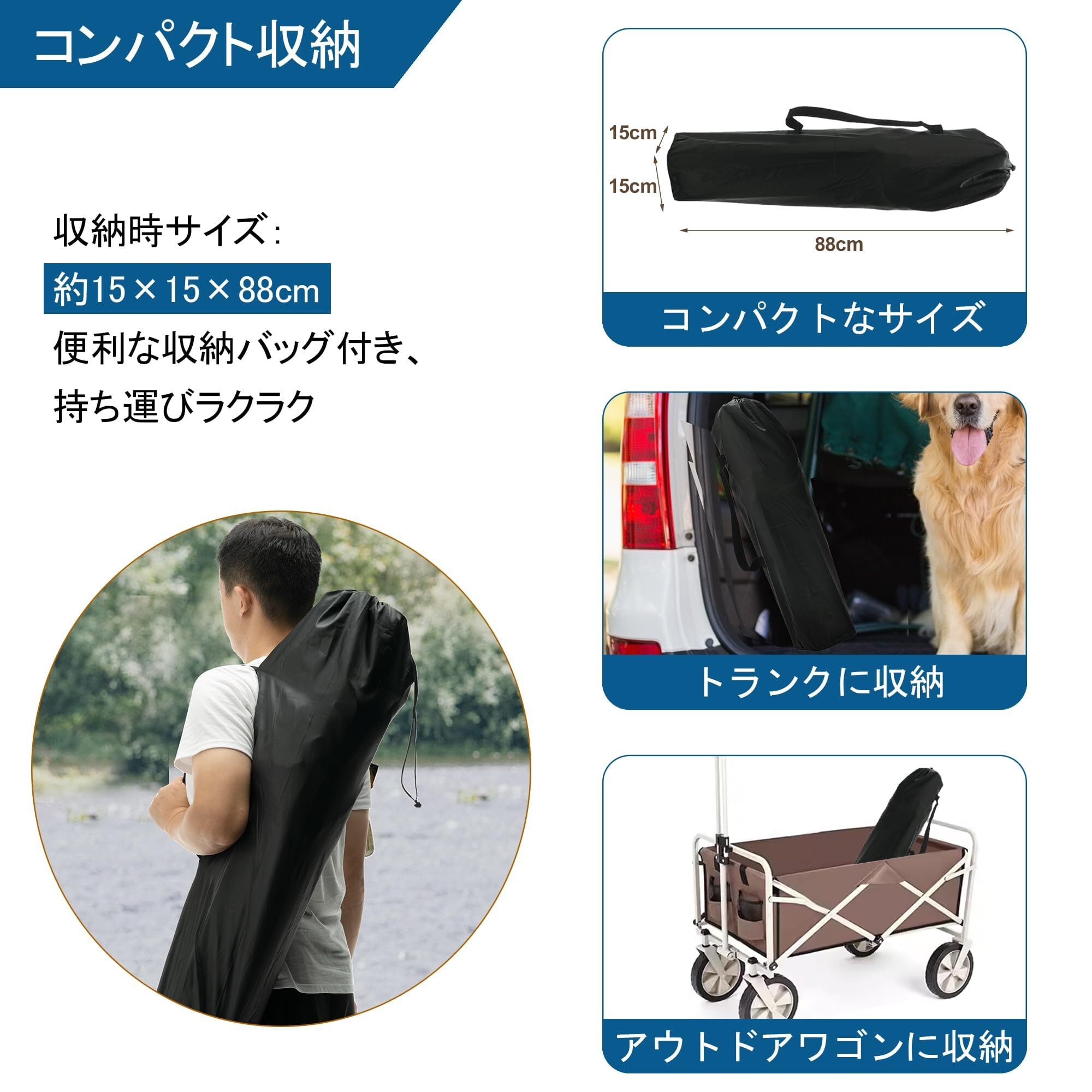 【持ち運び便利】重量:約3.63kg 耐荷重:150kg 。「広くサイズ」(約)83*52*77~85cm。「収納サイズ」(約)15*15*88cm。スペースを効果的に活用できます。折りたたんで収納する際も、場所を取らずに便利にご使用いただけます。軽量で収納しやすく、コンパクトで持ち運便利なアウトドア椅子です。