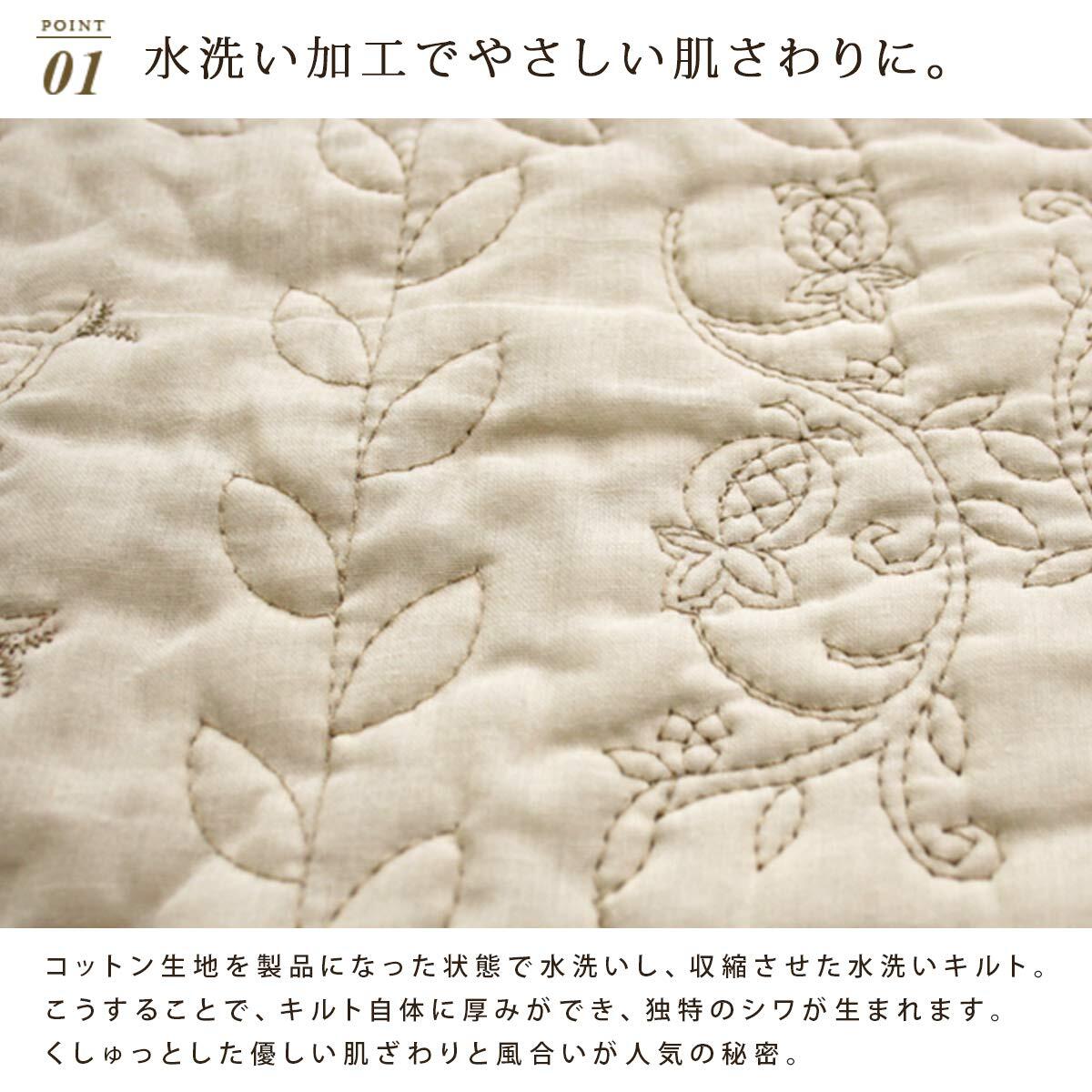 長座布団カバー2枚組のお得なセットです。とっても肌ざわりのよい綿生地をウォッシュキルト(水洗い)加工した素材感の豊かなカバーです。ウォッシュキルト(水洗いキルト)とは、コットンの生地を製品になった状態で水洗い加工を施して、収縮させたものです。キルト自体に厚みを持たせ、立体感のある肌ざわりと綿の独特のシワ感を出しています。水洗いすることで吸水性も良くなり、いつもさらっとした感触で使用できます。