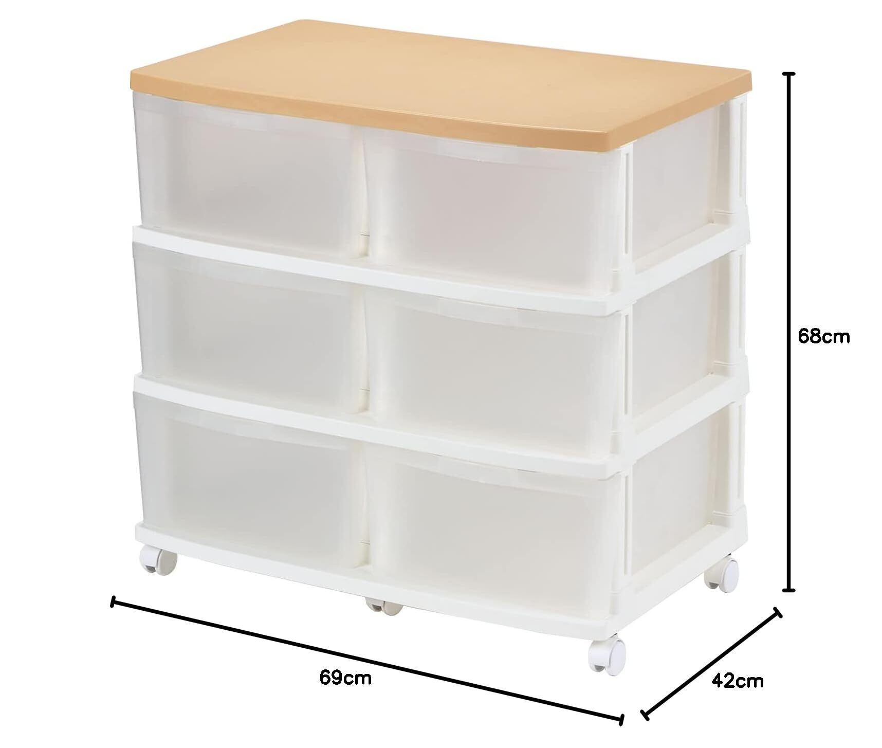 フルフラット強化天板使用で上に物を置くのに便利!補強を施し更に2重構造にしたことにより、プラスチックなのに約10kgの重さにも耐える天板を採用した便利な6引出しストッカー!