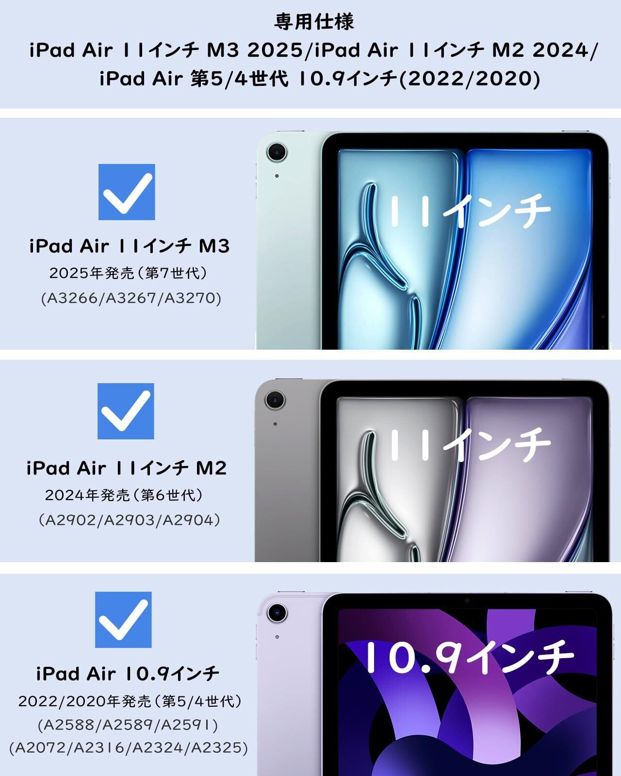 「対応機種」2025年新発売のiPad Air 11インチ(M3)第7世代(モデル番号:A3266、A3267、A3270)、2024年発売のiPad Air 11インチ(M2)第6世代(モデル番号:A2902、A2903、A2904)、2022年発売のiPad Air 第5世代(モデル番号:A2591、A2589、A2588)及び2020年発売のiPad Air 第4世代(モデル番号:A2316、A2324、A2325、A2072)10.9インチタブレットにカスタム設計しており、iPad(A16)第11世代 11インチ(×)、iPad 第10世代 10.9インチ(×)、iPad Air 13インチ M3/M2(×)、又は他のモデルには適用しません。ご購入の前にタブレットの機種/モデル番号を予めご確認ください。