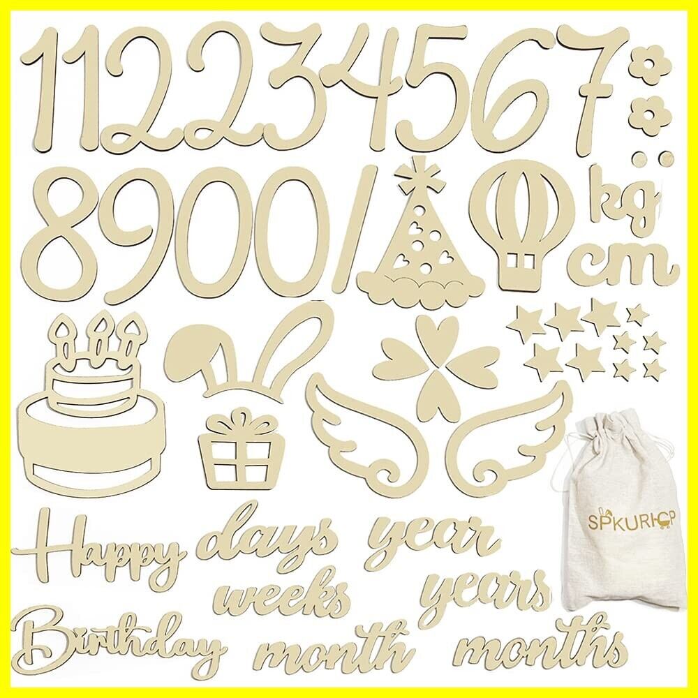 【セット内容】合計49枚セット、0*2枚、1*2枚、2*2枚、3~9各1枚、王冠*1枚、花*2枚、羽*2枚、ハート*4枚、ケーキ*1枚、ギフト*1枚、ウサギ耳*1枚、点*2枚、斜線*1枚、星*10(2サイズ)、kg、cm、happy、birthday、days、weeks、month、months、year、years各一枚、合計49枚、サイズ:写真欄にご参照ください。素材:ウッド、厚さ:約4mm