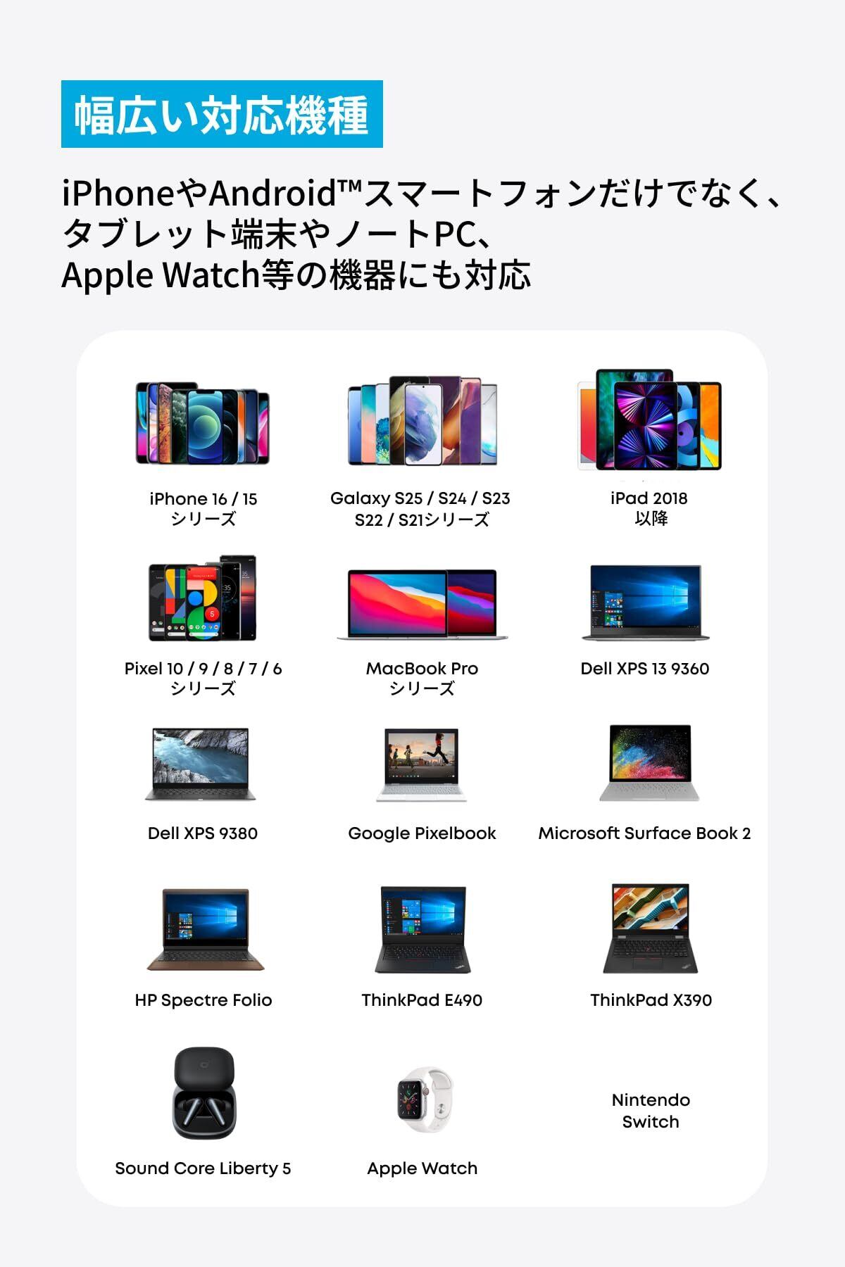 独自技術「Anker GaN II」 採用:GaN(窒化ガリウム)搭載USB充電器が第二世代に進化。電源ICと回路設計に革新を起こすことで、スイッチング周波数を当社比で約2倍に高めて電子部品を省サイズ化するとともに、熱およびEMI(ノイズ)対策を施し厳しい安全基準を満たしながらさらなる小型軽量デザインを実現しました。