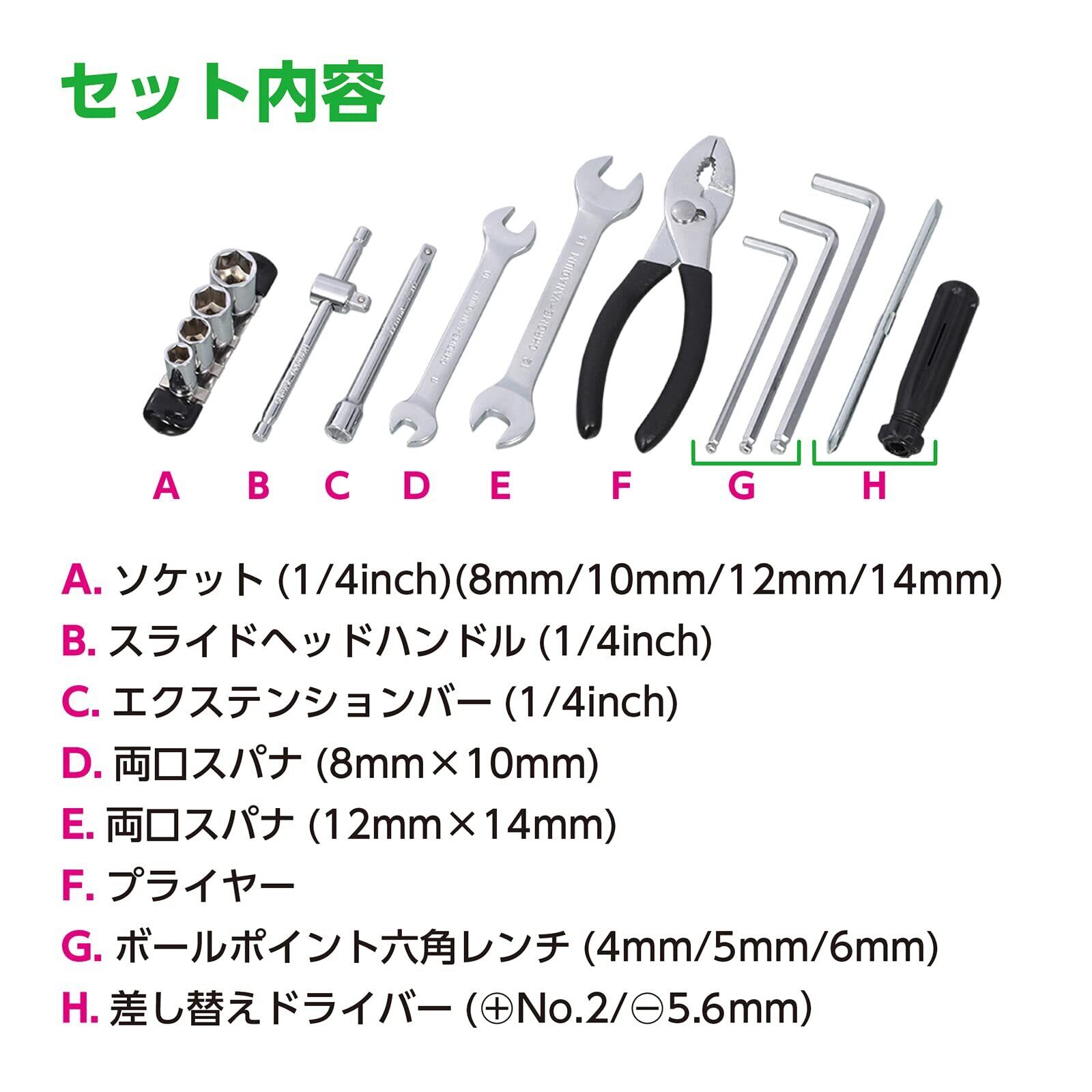 セット内容 ソケット(1/4インチ) 8mm/10mm/12mm/14mm | スライドヘッドハンドル(1/4インチ) | エクステンションバー(1/4インチ) | 両口スパナ(8mm×10mm) | 両口スパナ(12mm×14mm) | プライヤー | ボールポイント六角レンチ(4mm/5mm/6mm) | 差し替えドライバー(⊕No.2/⊖5.6mm)