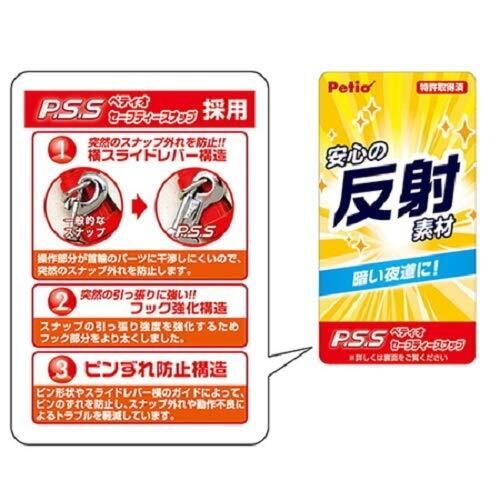 編み込まれた反射材で夜のお散歩も安心です。反射の量も増えました。突然のスナップ外れを防止する横スライドレバー構造のP.S.S(ペティオセーフティスナップ)採用! !