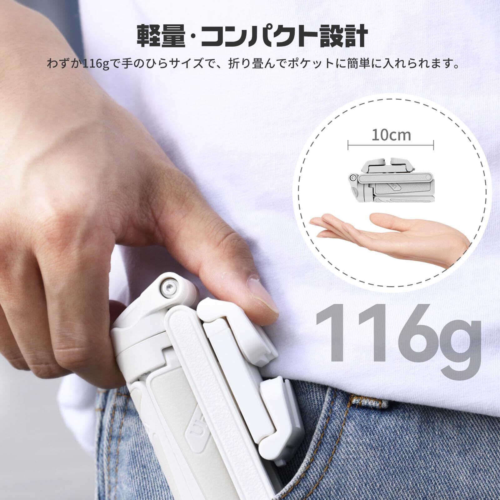 【超コンパクト・4 in 1スマホ三脚】Ulanzi 2024年新発売された多機能スマホ三脚です。一体型デザインにより、これ1つでカメラグリップ、自撮り棒、ミニ三脚、スマホスタンドとして使用でき、様々な撮影シナリオに合わせて自由に変換して使用できます。わずか116g、10cmの超軽量コンパクトなサイズで、カバンやポケットに簡単に入れ持ち歩けて、とても使いやすいです。