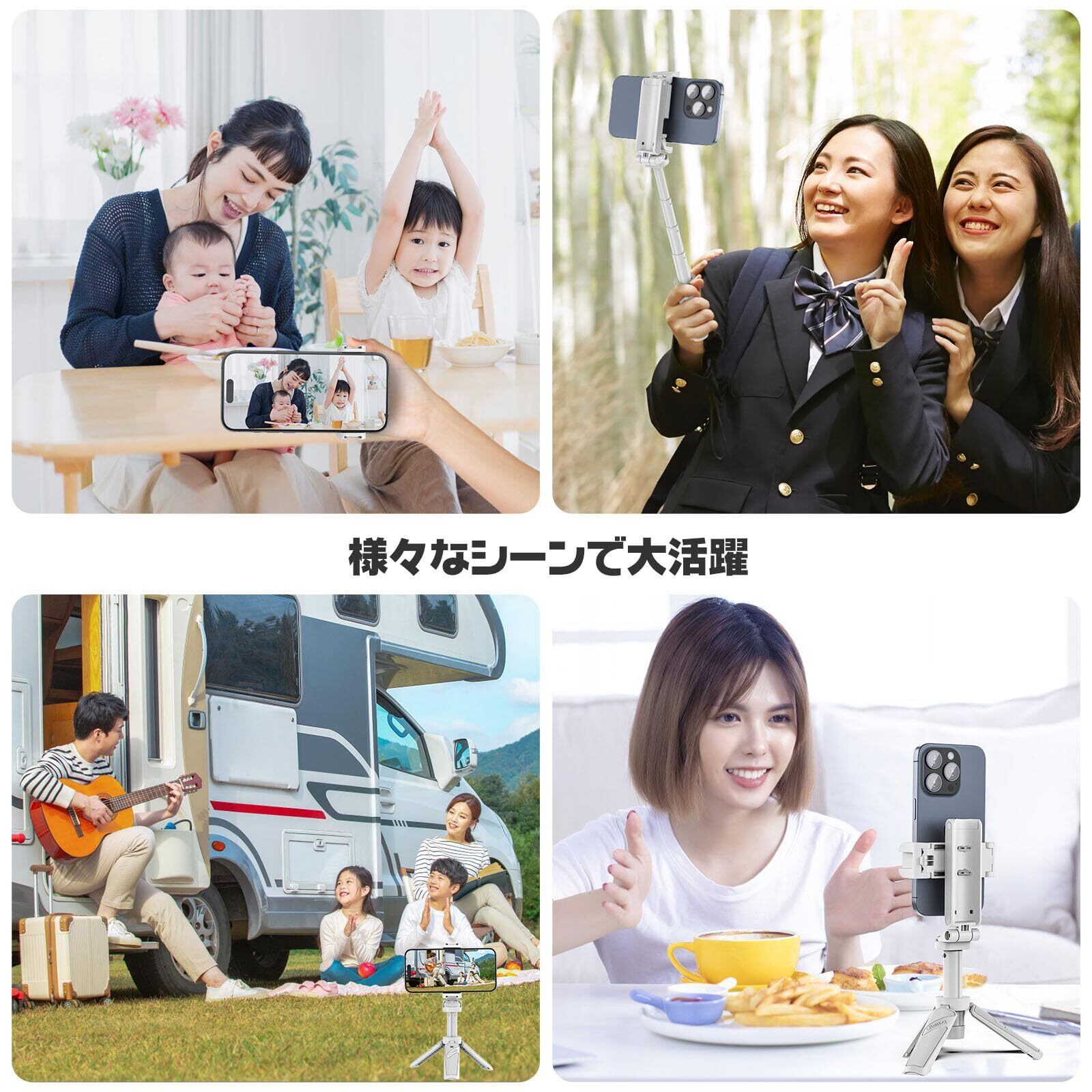 【伸縮式自撮り棒/ミニ三脚モード】JJ02スマホグリップは、自撮りや高いところの撮影に適した伸縮式セルフィースティックを内蔵しており、4段階調整で最長36.5cmまで伸びます。また、360°回転するスマホホルダーにより、縦・横・斜め撮影が可能です。セルカ棒とスマホ三脚スタンドを自由変換して、手持ちのセルフィーだけでなく、動画鑑賞、集合写真、生放送、Youtube、オンライン会議などに適用です。ご注意:商品が軽量なので、俯瞰撮影に対応しません。首を下げるとスマホの重みで前向きに倒れる可能があります。