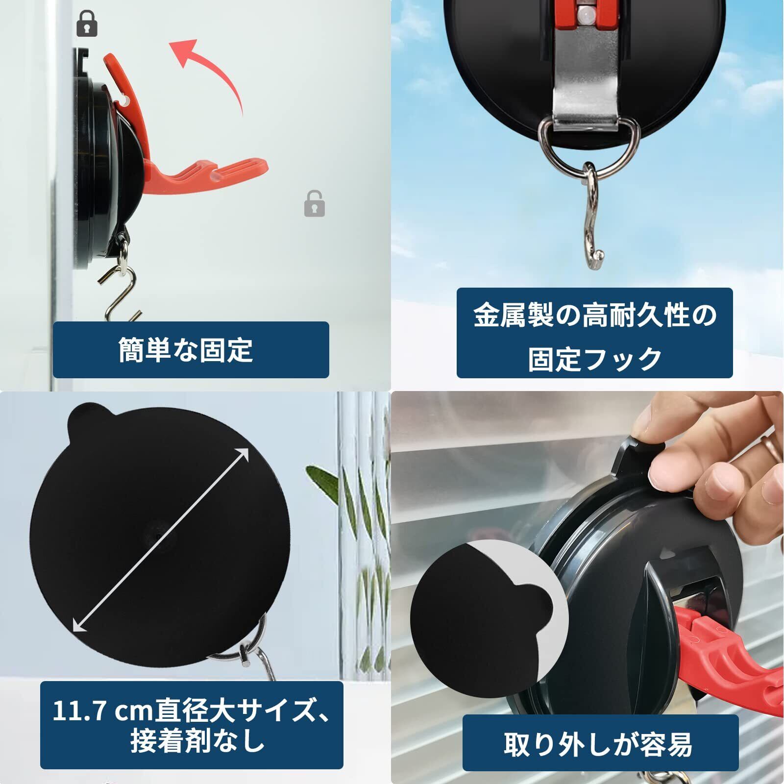 【4個入り、直径11.7cm、 強力真空吸盤フックセット】セット内容:吸盤フック4個、S字フック8個。吸盤素材:PVC+ABS・サイズ:直径11.7cm*厚さ5cm・耐荷重:静止状態で70kg