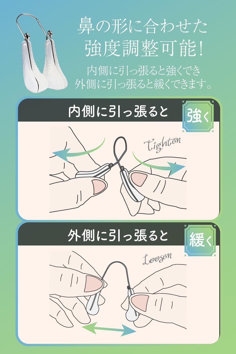 【ご自分の形に合わせれるデザイン】内外を引っ張る事で強度を自在に変更できるので、ご自分の鼻の形に合わせた調整が可能です。 ※強く引っ張ると金具が変形、折れにつながりますので優しくお願いいたします。鼻の脂をきちっとふき取ってから使用してください。