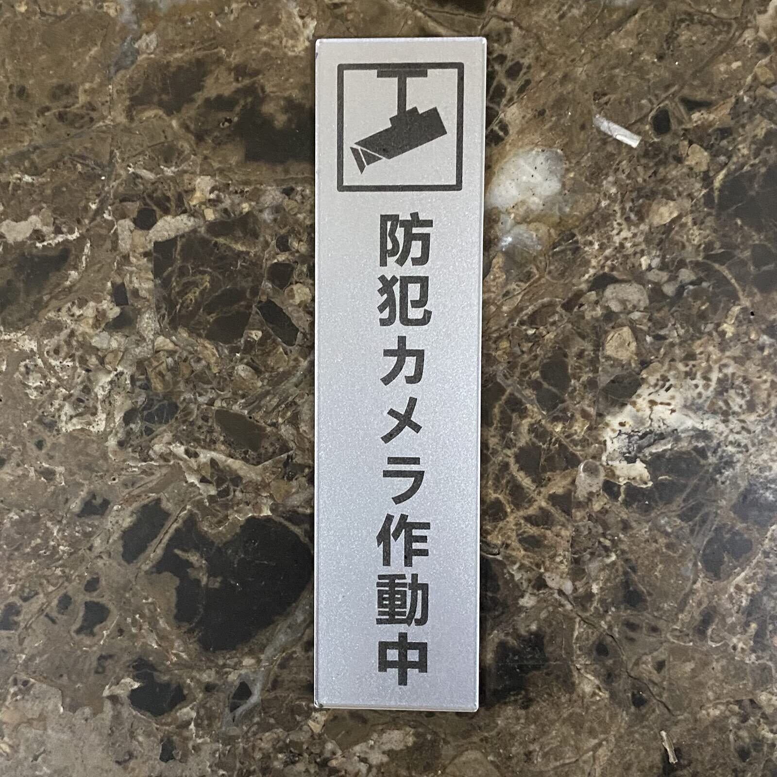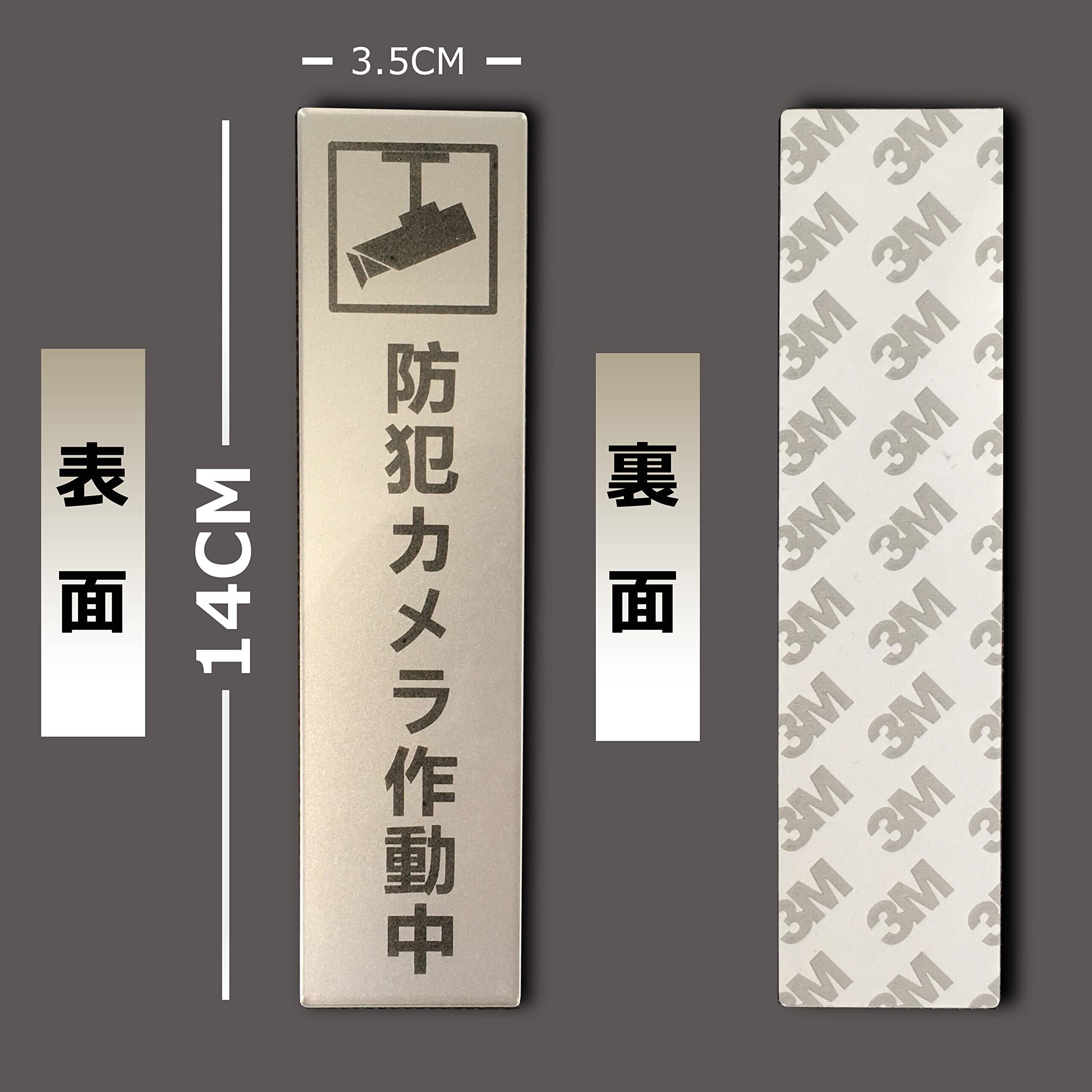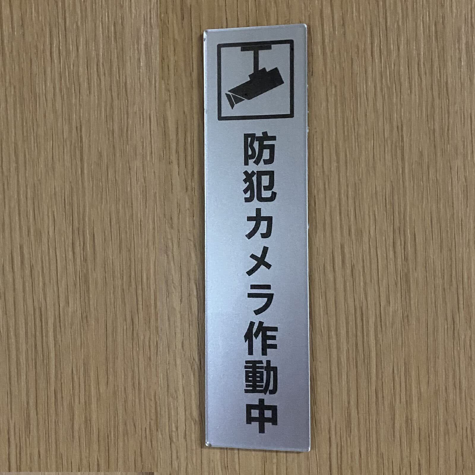 防犯カメラ作動中 タテ型 サインプレート 両面テープ付き シルバー色 2㎜アクリル製 おしゃれ 14×3.5㎝ (1枚入り)