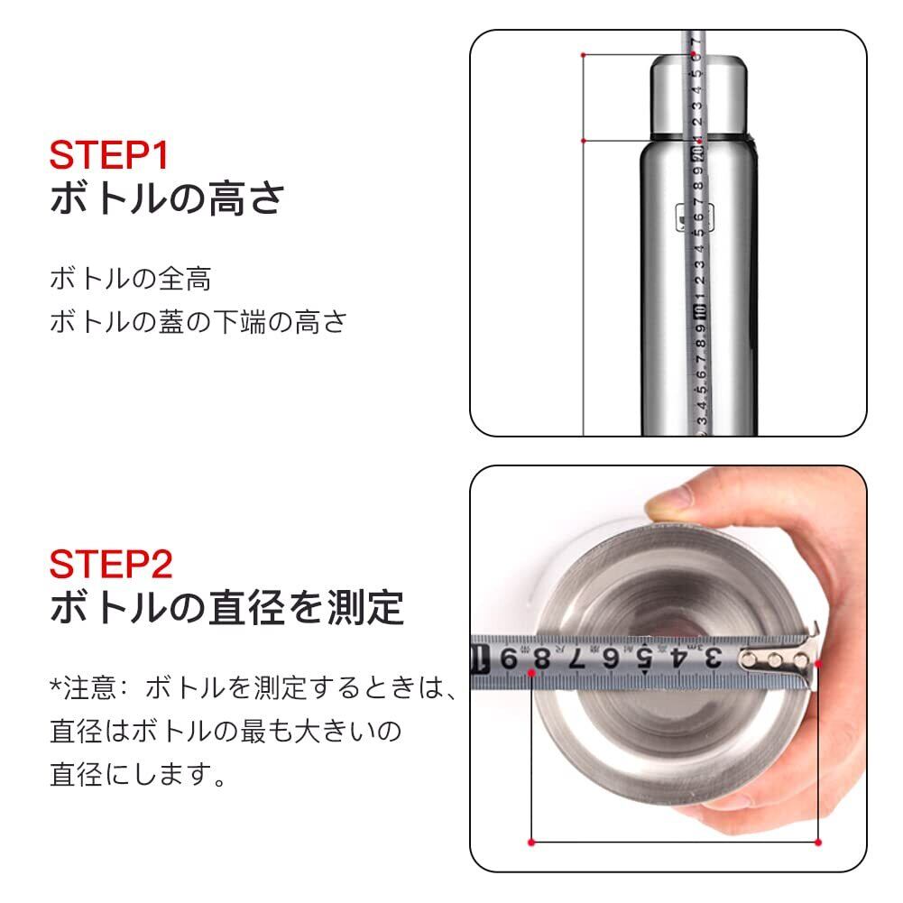 【正しいボトルを測定する方法】購入する前にボトルのサイズを測定する必要があります。ボトルの全高とボトルの蓋の下端の高さを測定してから、ボトルの直径を測定します。*注意:ボトルを測定するときは、直径はボトルの最も大きいの直径にします。(一部のボトルでは上下の直径が異なります。ボトル本体の最も大きい位置を測定することを忘れないでください)。