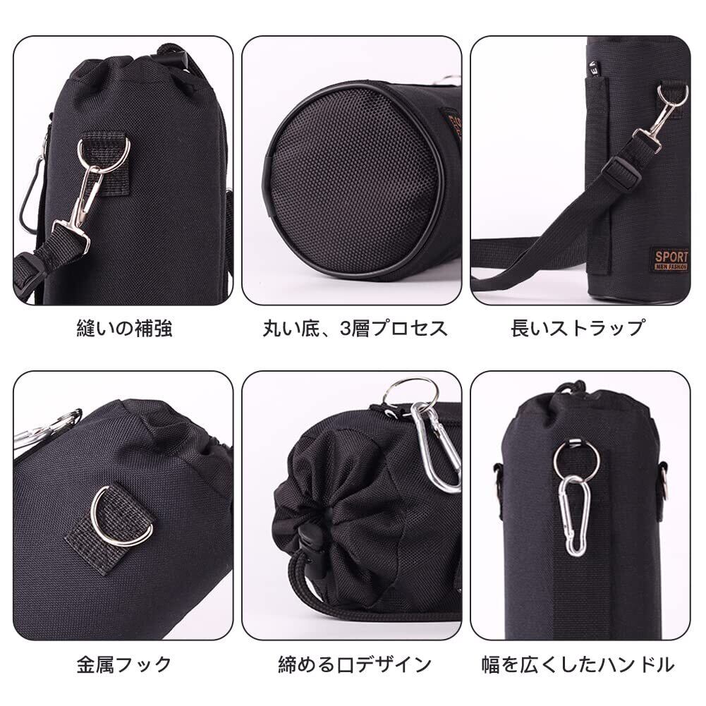 【デザイン】黒と赤二つの色が選択でき、①3層の素材は厚い、保温・保冷の機能を持つ。②取り外し・長さ調節可能の140cmショルダーストラップ。③多種のサイズ、400〜1500mlのボトルに適用。④金属フックは耐久性があります。⑤持ち運びのは便利。いろんな持ち運ぶ方(ハンドルで手提げ、ストラップで肩掛け、斜めひき、ベルトを掛ける方、登山フックで掛ける方)。⑥締める口は引きひもはロックデザインを採用し、滑らかでくっつかず、繰り返し使用できます。