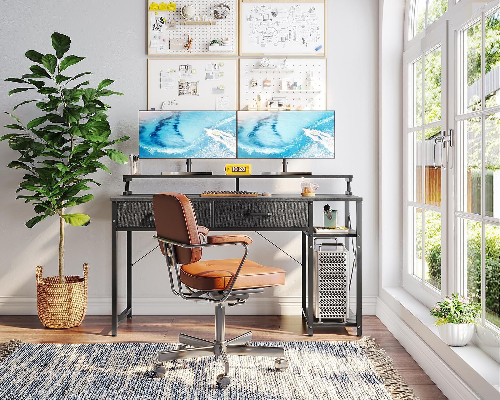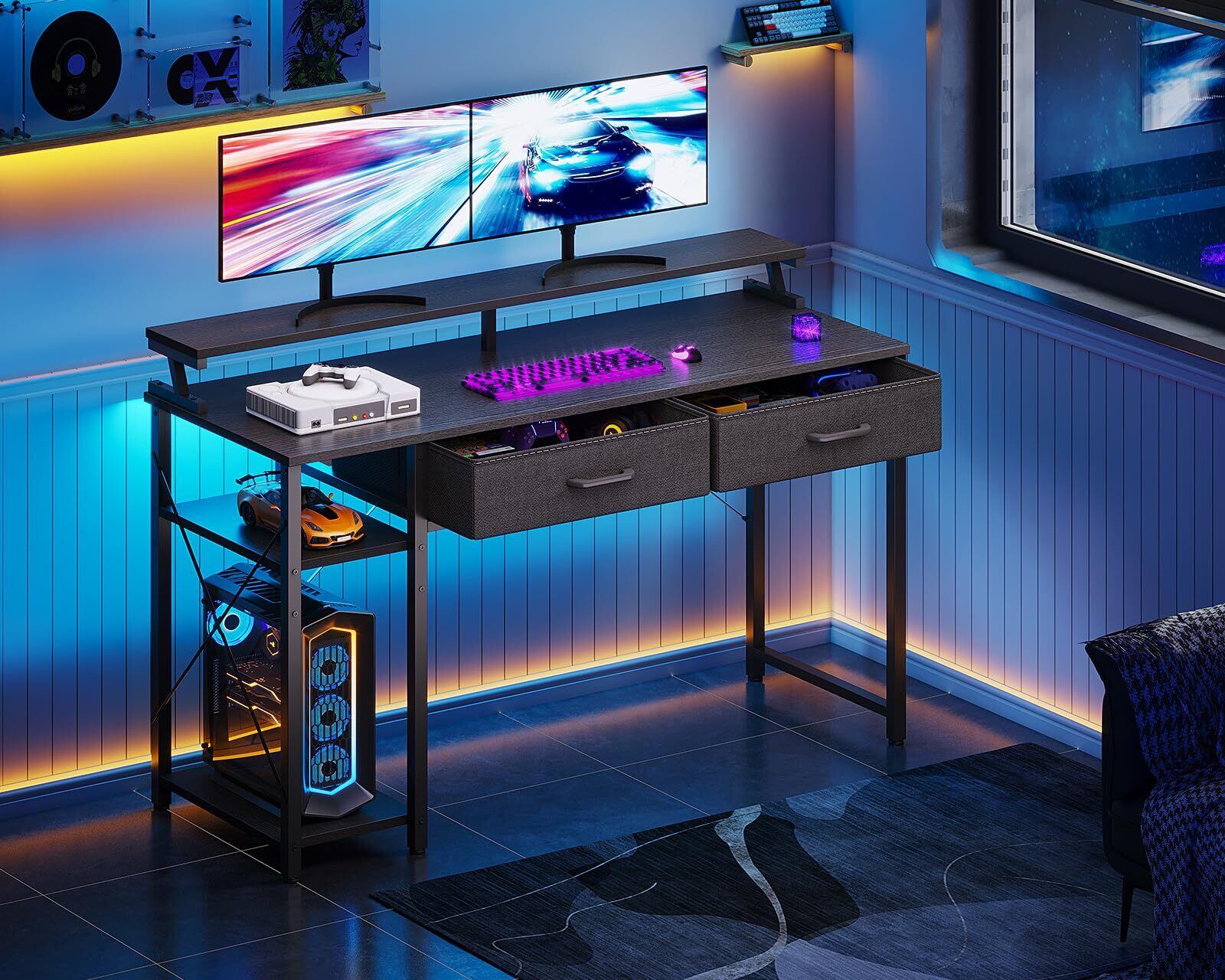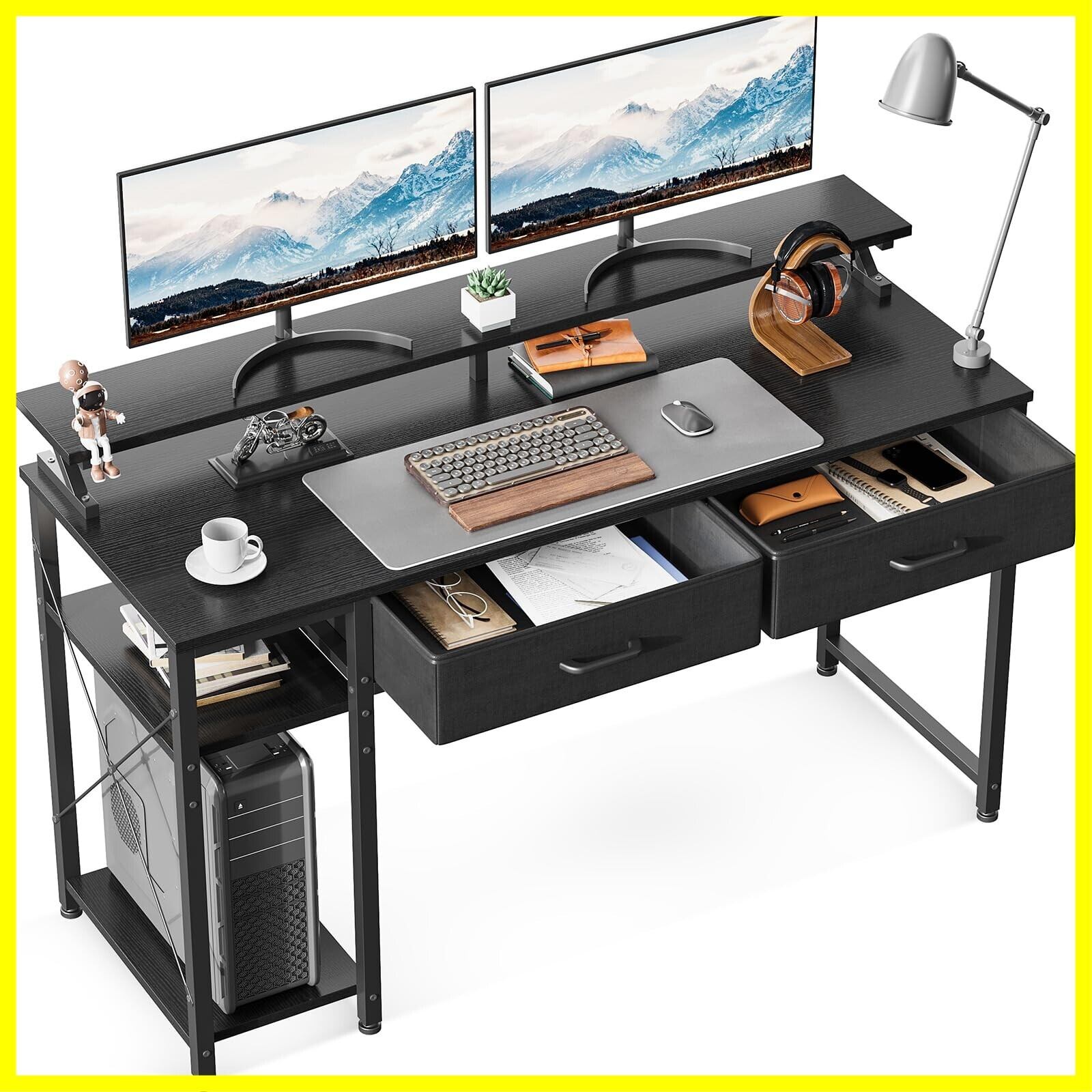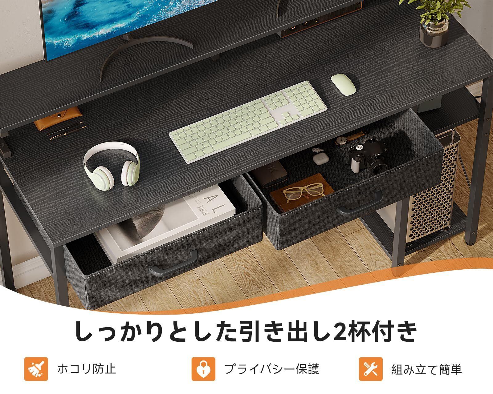 ODK ゲーミングデスク ラック&引き出し2杯付き 幅120cm パソコンデスク 机 pcデスク モニター台付き ワークデスク オフィスデスク おしゃれ 省スペース 一人暮らし 在宅勤務 左右入れ替え対応 ブラック