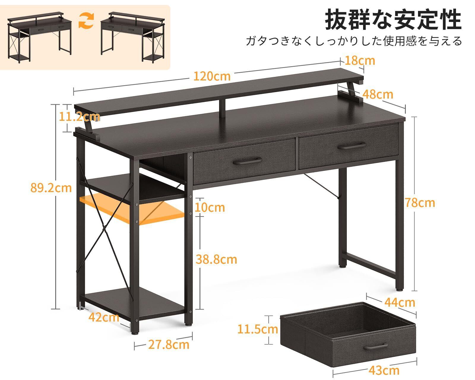 【商品仕様】実用性と収納力の両立にこだわる引き出し付きデスクです。◆本体サイズ:幅120×奥行48×高さ89.2cm(床から主天板までの高さは78cm) | 日本語組立説明書あり | お客様組立て品で、レンチも付属しており、別途で工具を買う必要がないです。